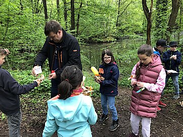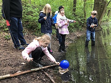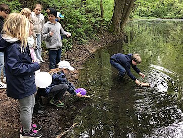 Die Exkursion nutzen wir auch, um unser Wissen aus dem Sachunterricht zu festigen. Gemeinsam überlegten wir, um welche Kleingewässerart es sich handelt und benannten die Merkmale. Außerdem suchten wir nach typischen Pflanzen und Tieren und bestimmten diese.