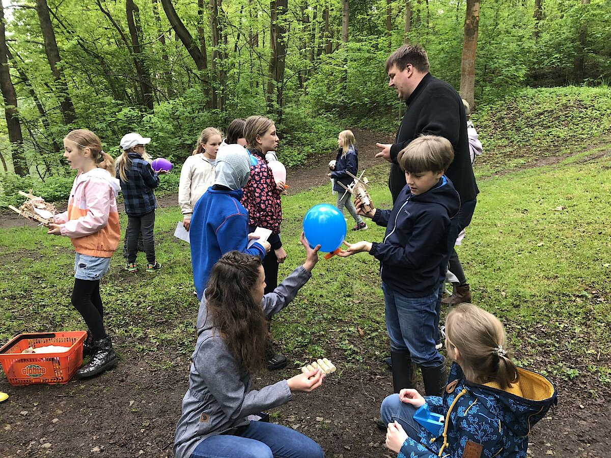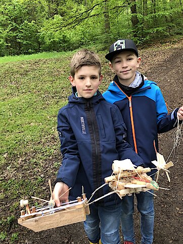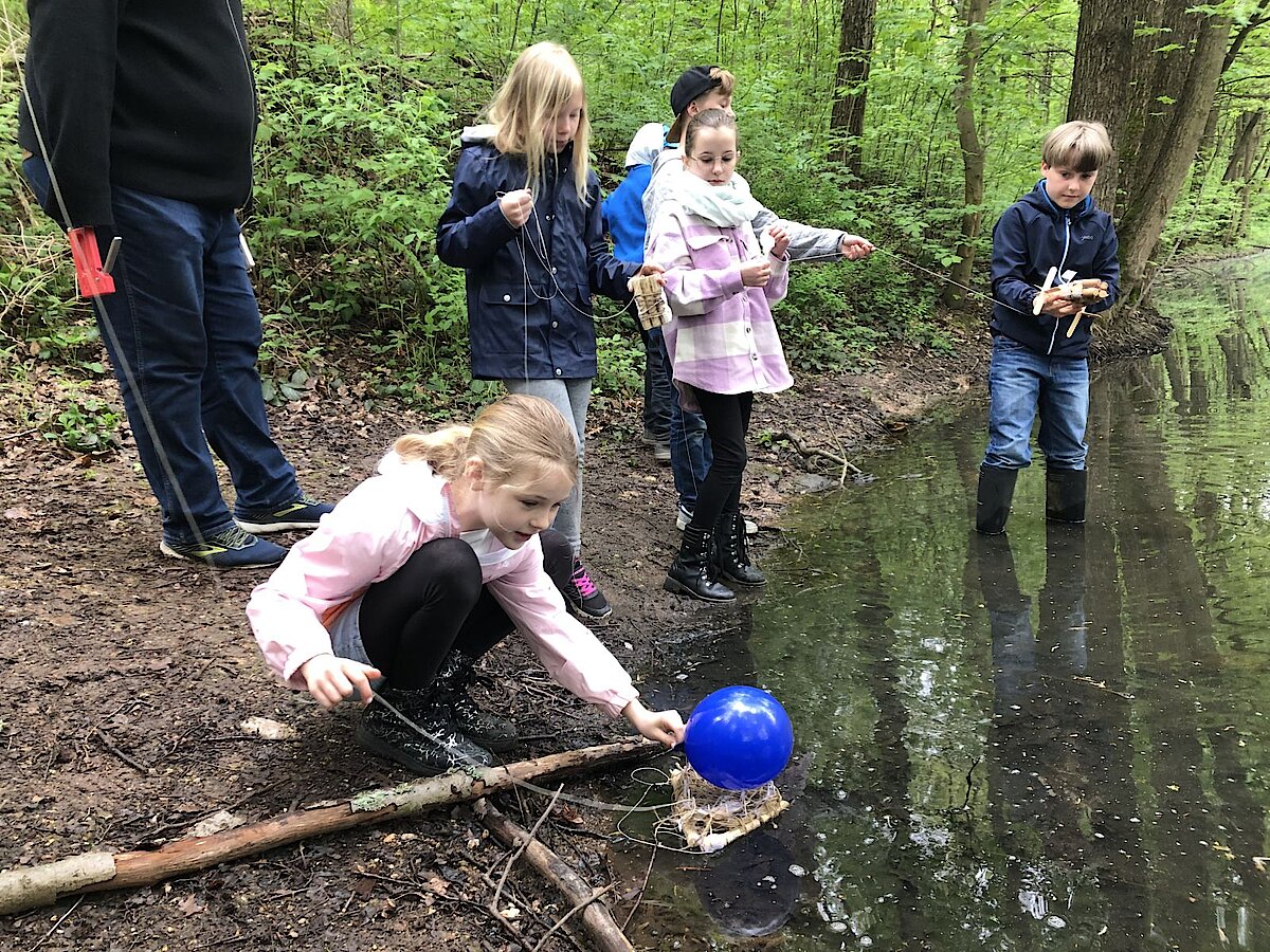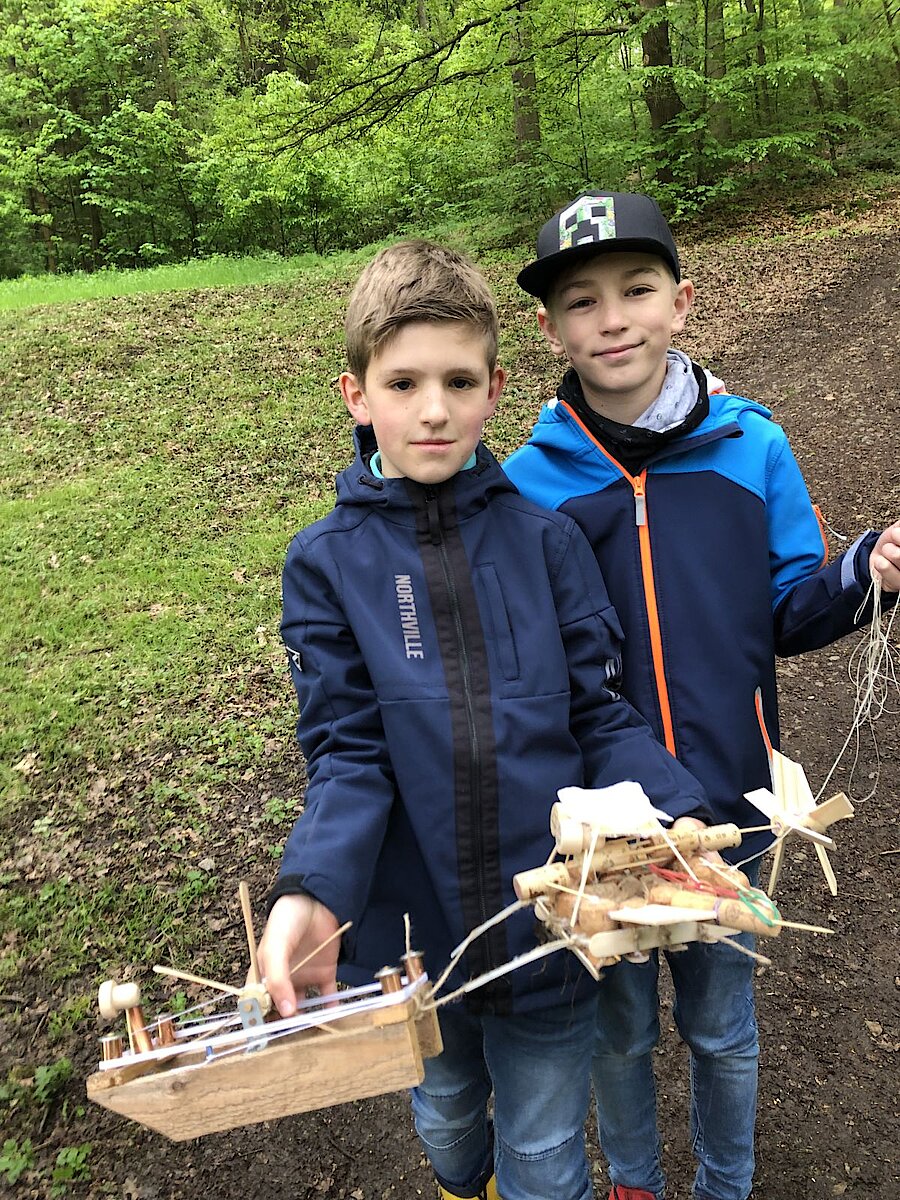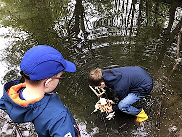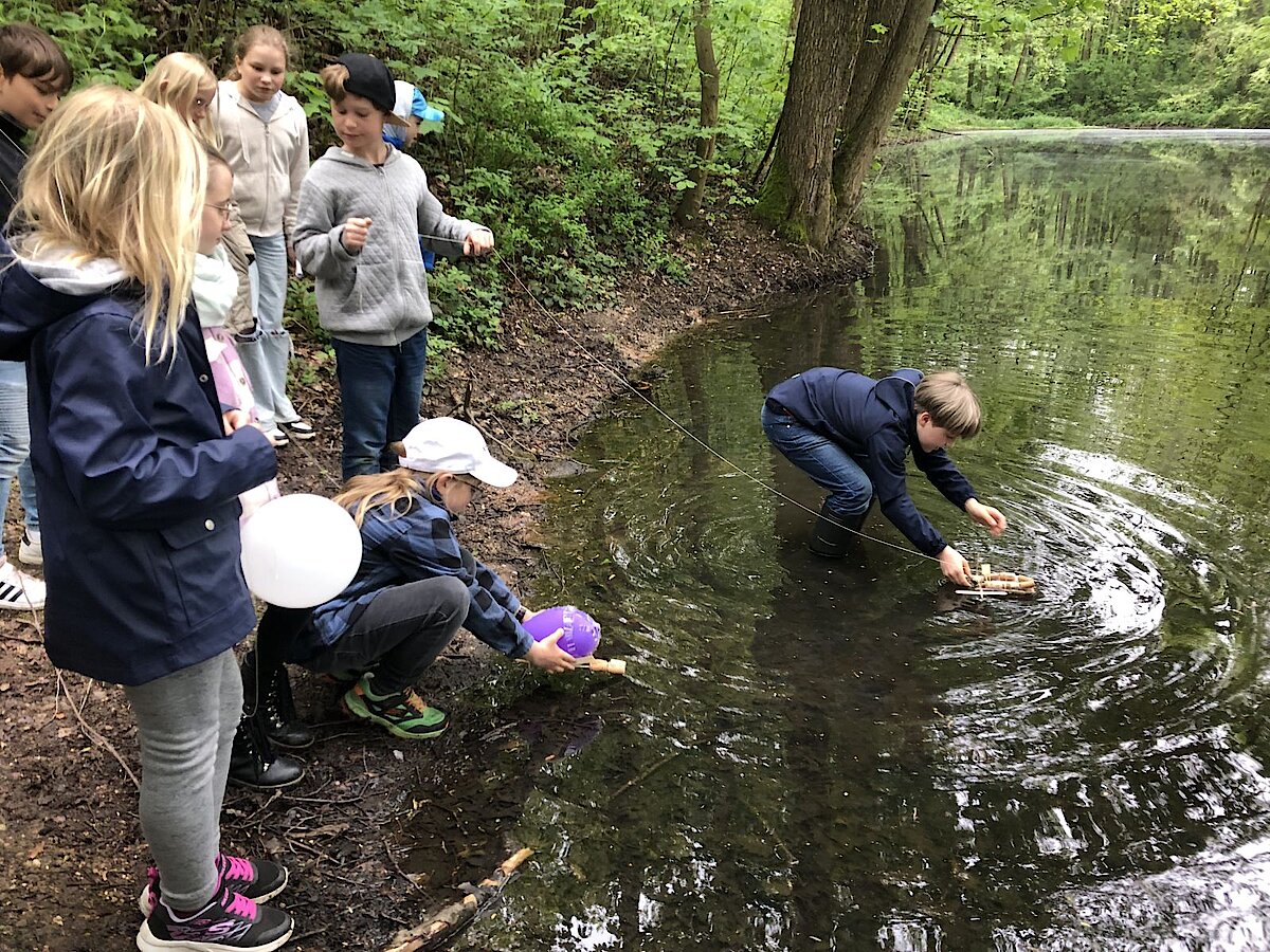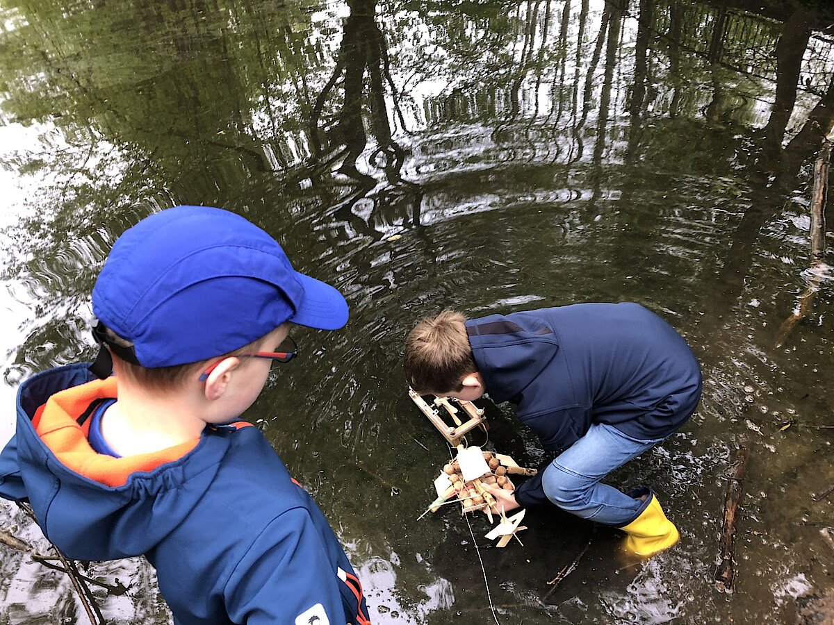 In dieser Woche war es endlich so weit und die Bootsflotte konnte zu Wasser gelassen werden. Schon seit April werkelten die Kinder an ihren Schiffen, die sie im Werkenunterricht sorgfältig geplant, konstruiert, gebaut und mit einem Antrieb versehen hatten. Dazu verwendeten sie vorrangig Weinkorken, Zahnstocher und Zungenspatel aus Holz sowie Juteschnur. Jedes Boot war individuell gestaltet. Die größte Herausforderung war, das Boot mit einfachen Mitteln mit einem Antrieb zu versehen. Es entstanden Schaufelräder und Luftballonantriebe nach dem Rückstoßprinzip. Wie stolz waren die Kinder, wenn sich ihr Boot aus eigener Kraft im Wasser bewegte! Wieder im Klassenzimmer zurück, überlegten wir gemeinsam, was man beim nächsten Mal noch verbessern könnte. Alle fühlten sich wie richtige Bootsbauingenieure und –ingenieurinnen und fachsimpelten.
