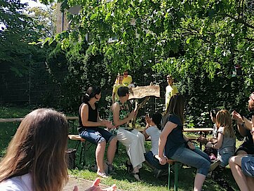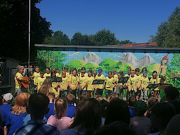 Die Klassen 4 widmeten sich „Lieder[n], die wie Brücken sind“ von Rolf Zuckowski und wagten sich sogar an ein musikalisches Streitgespräch zwischen verschiedenen Instrumenten.