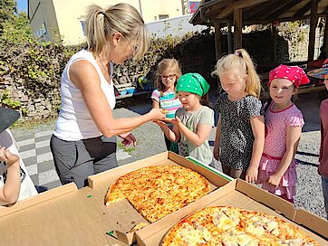 Gegen Mittag verspeisten alle Hungrigen die leckere Pizza, die uns frisch geliefert wurde.