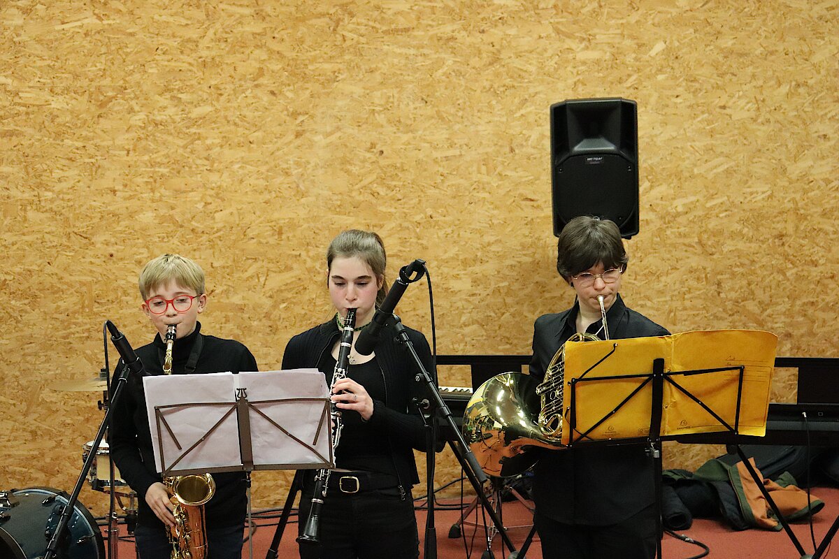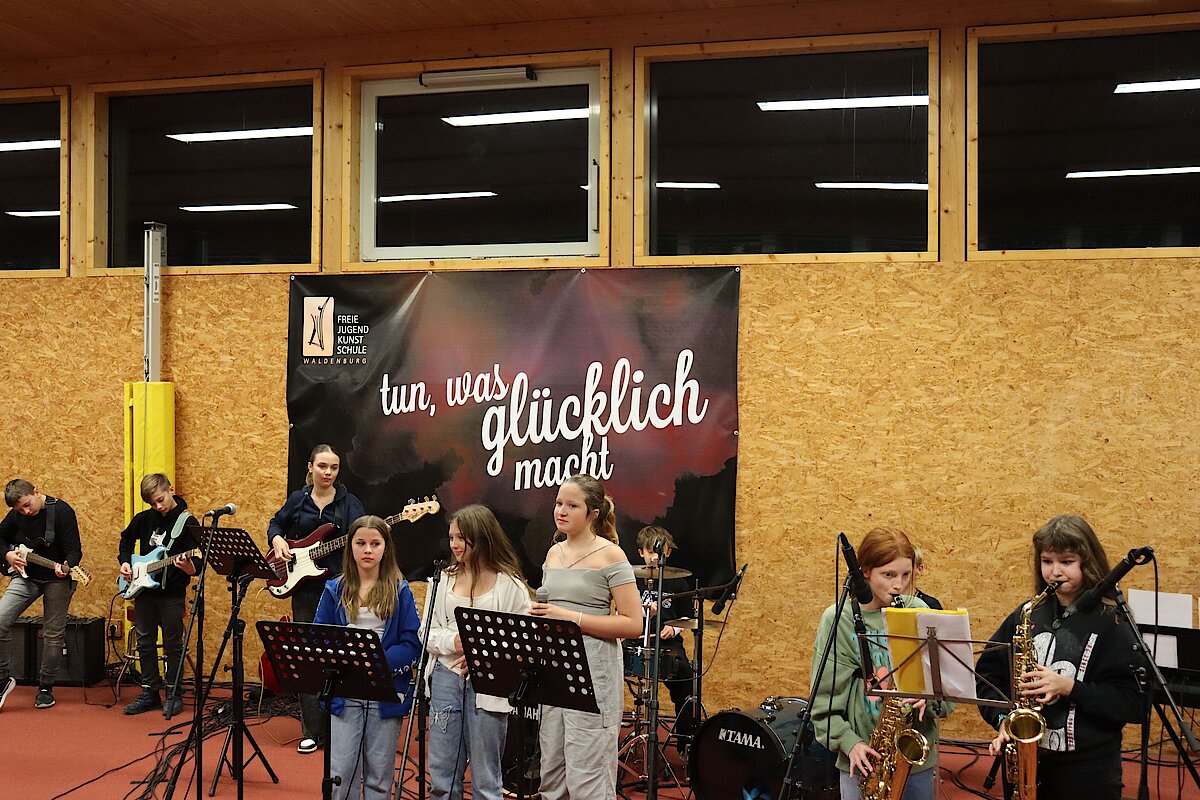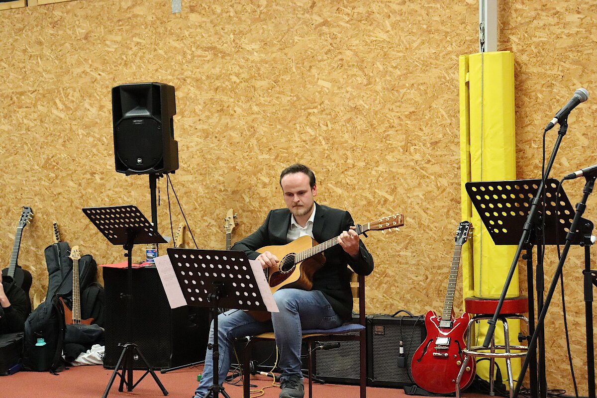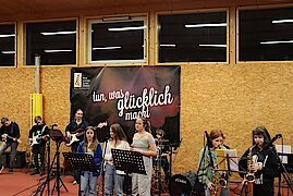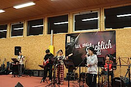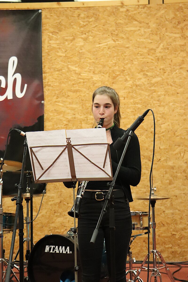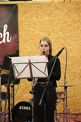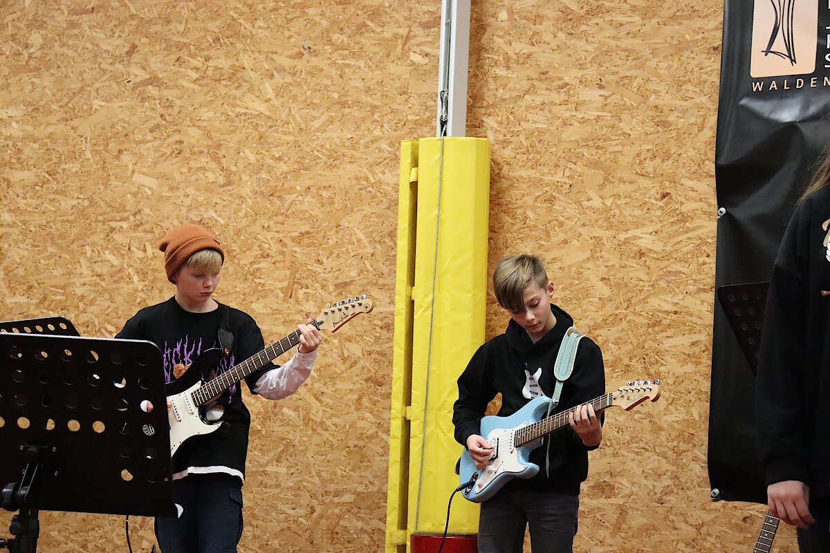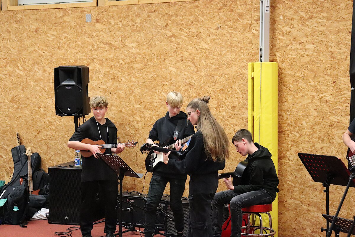 Den Auftakt der Veranstaltung machte die Bandklasse 6 gefolgt von der Solistin Lena Calov mit der Klarinette und begleitet wurde sie von ihrem Lehrer Herr Arnold am Klavier. Danach spielte die ausländische Band „Hey2Lent“ zwei Titel. „21 Guns“ von Green Day präsentierte Benjamin Weidhase mit seiner Gitarre. Der nächste Block gehörte der 12 köpfigen Profilband 8, welche aus 3 Sängerinnen, 4 Gitarren, einem Bass, einem Schlagzeug und drei Bläser besteht. Was fürs Herz bot Jule Geißler mit „Love of my life“ begleitet von dem Instrumentallehrer Herr Meiner an der Gitarre. Die letzten beiden Beiträge wurden wieder rockig und brachten die Stimmung in der Turnhalle zum Kochen. Die Internatsband unter der Leitung von Michael Lorenz spielte „Zombie“ von den Cranberries und „Bad Liar“ von Imagine Dragons. Den Abschluss des Bandabends gestaltete die „Friday Rehearsal Band“. Diese Band besteht aus Internatsschülern, Gymnasiasten sowie Oberschüler und sie zeigten mit Herrn Vorobel, dem Bandleiter, wie schön es ist gemeinsam zu musizieren. Neben populären Beiträgen stimmten sie uns mit „Feliz Navidad“ in die Weihnachtszeit ein. Wir danken allen Gästen und Mitwirkenden sowie den Technikern Marek Arnold und Vincent Rudlof.