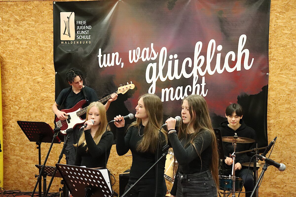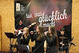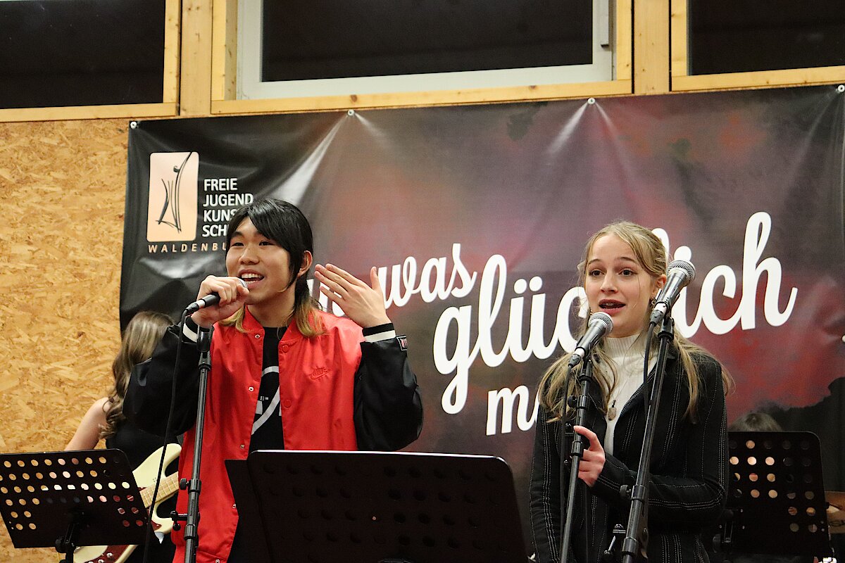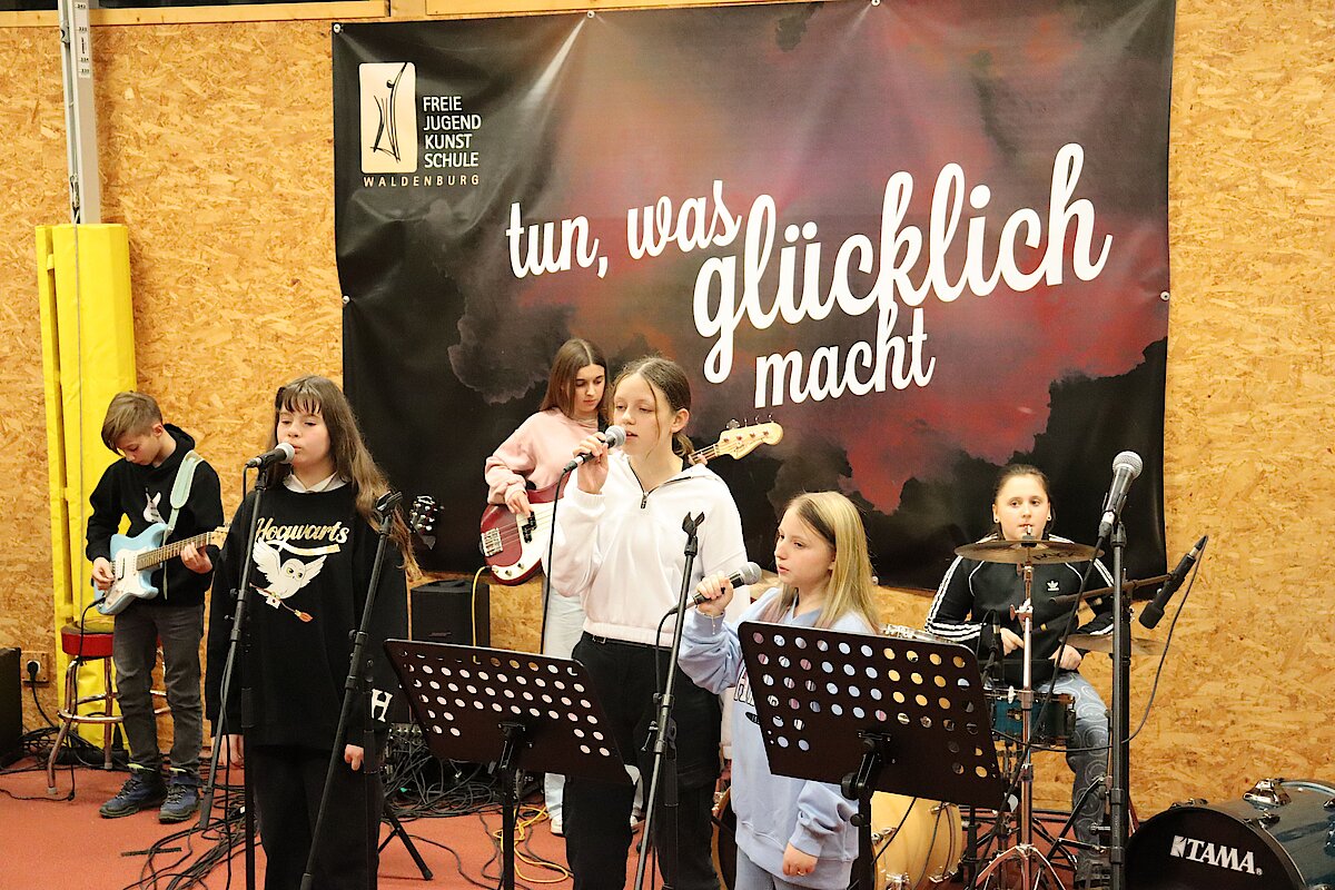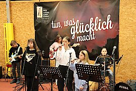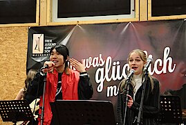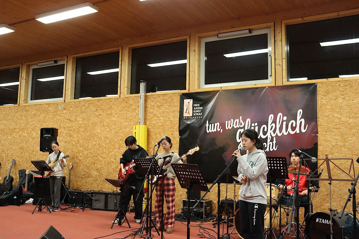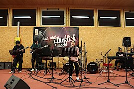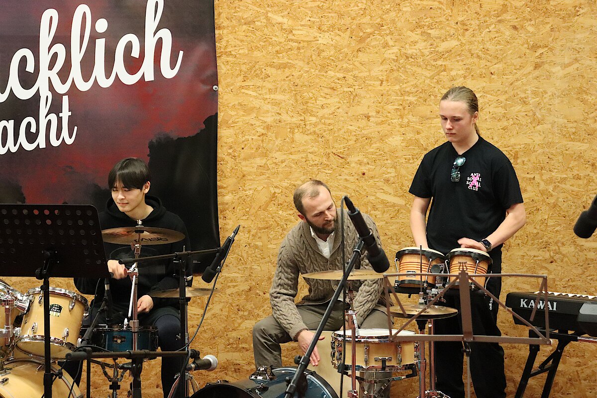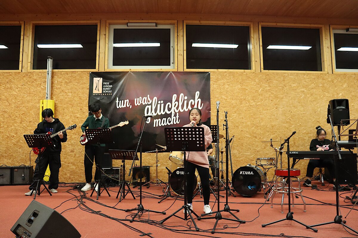 Den Auftakt der Veranstaltung machte die Bandklasse 6 gefolgt von der Solistin Lena Calov mit der Klarinette und begleitet wurde sie von ihrem Lehrer Herr Arnold am Klavier. Danach spielte die ausländische Band „Hey2Lent“ zwei Titel. „21 Guns“ von Green Day präsentierte Benjamin Weidhase mit seiner Gitarre. Der nächste Block gehörte der 12 köpfigen Profilband 8, welche aus 3 Sängerinnen, 4 Gitarren, einem Bass, einem Schlagzeug und drei Bläser besteht. Was fürs Herz bot Jule Geißler mit „Love of my life“ begleitet von dem Instrumentallehrer Herr Meiner an der Gitarre. Die letzten beiden Beiträge wurden wieder rockig und brachten die Stimmung in der Turnhalle zum Kochen. Die Internatsband unter der Leitung von Michael Lorenz spielte „Zombie“ von den Cranberries und „Bad Liar“ von Imagine Dragons. Den Abschluss des Bandabends gestaltete die „Friday Rehearsal Band“. Diese Band besteht aus Internatsschülern, Gymnasiasten sowie Oberschüler und sie zeigten mit Herrn Vorobel, dem Bandleiter, wie schön es ist gemeinsam zu musizieren. Neben populären Beiträgen stimmten sie uns mit „Feliz Navidad“ in die Weihnachtszeit ein. Wir danken allen Gästen und Mitwirkenden sowie den Technikern Marek Arnold und Vincent Rudlof.