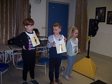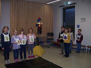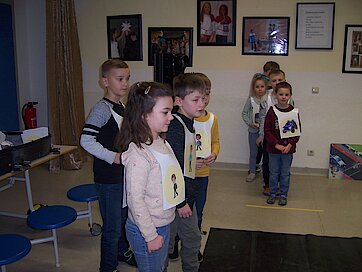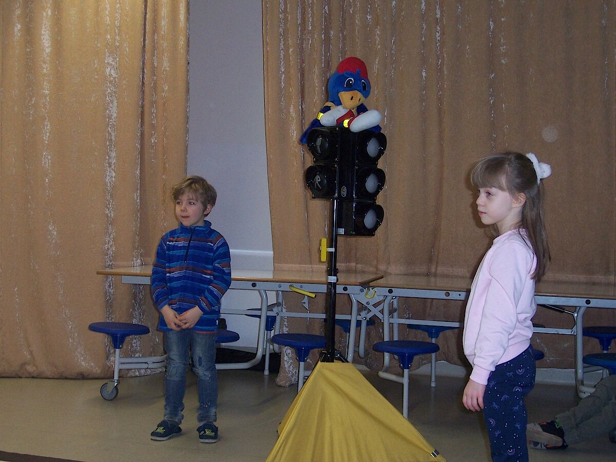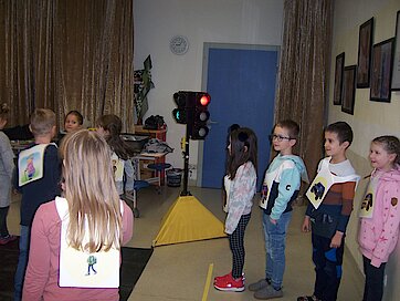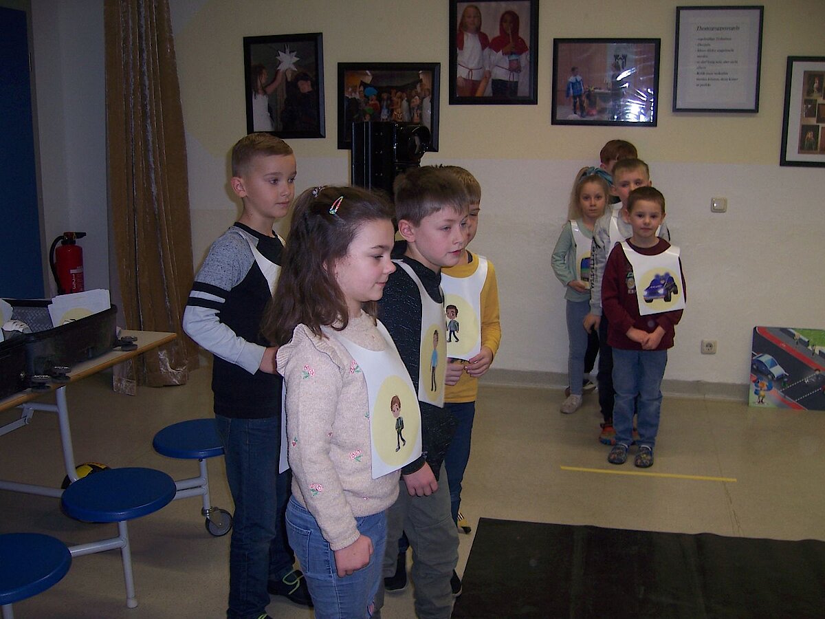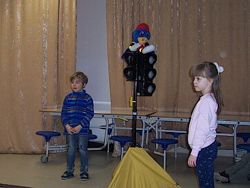 Die Kinder haben ein Lied gehört, in dem es um viele Verkehrsregeln ging. Diese wurden im Anschluss besprochen und teilweise nachgespielt.