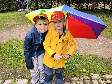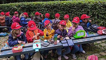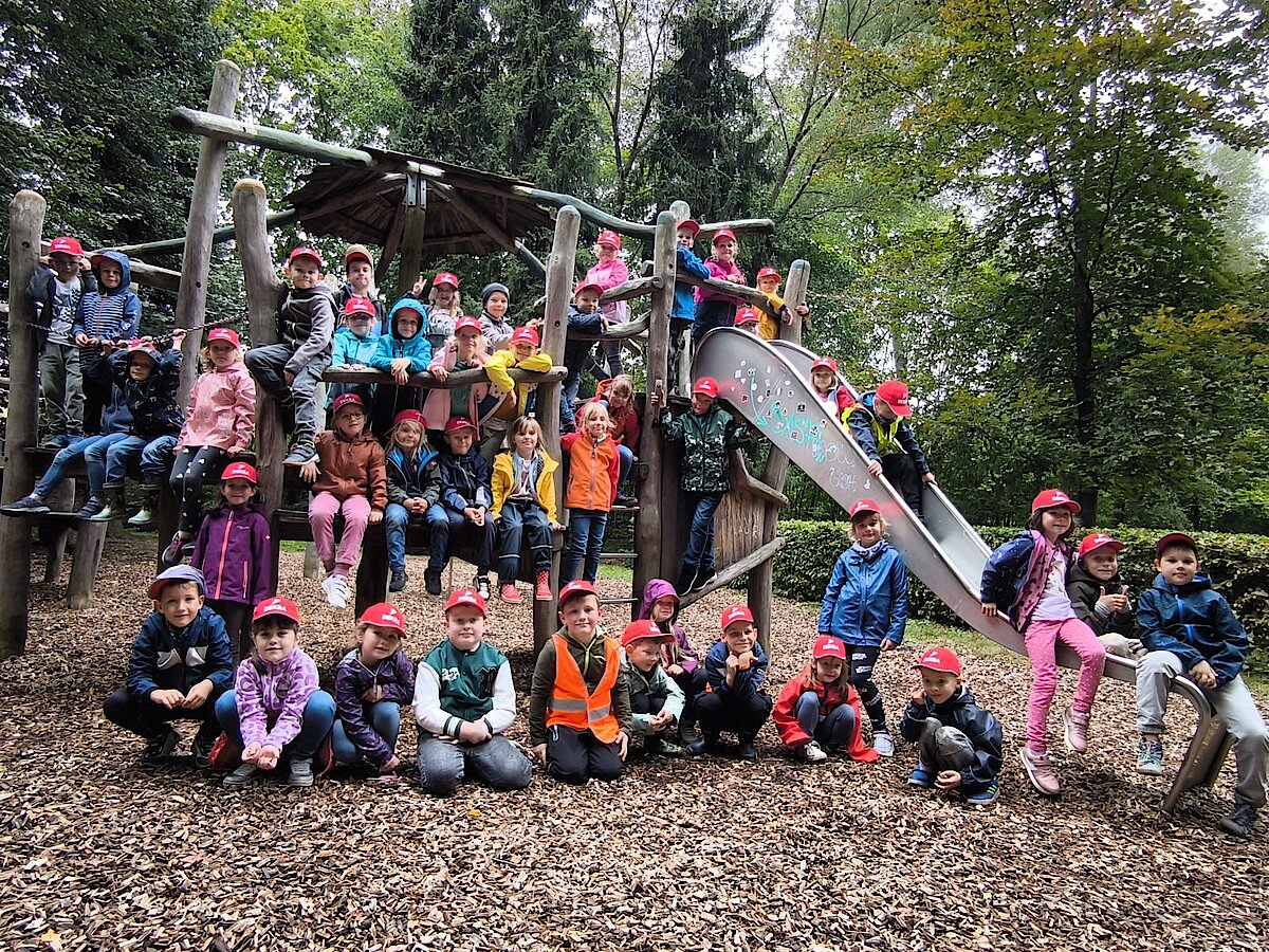Danach wanderten wir zum schönen Spielplatz im Parkschlößchen. Dort frühstückten die Kinder, kletterten, rutschten, spielten zusammen und rannten ausgelassen umher. Vom Regen blieben wir verschont und kamen pünktlich zum Mittagessen wieder in der Schule an. Hoffentlich erleben wir noch viele von diesen schönen Tagen, gemeinsam mit den Kindern beider 1. Klassen.