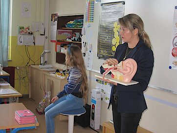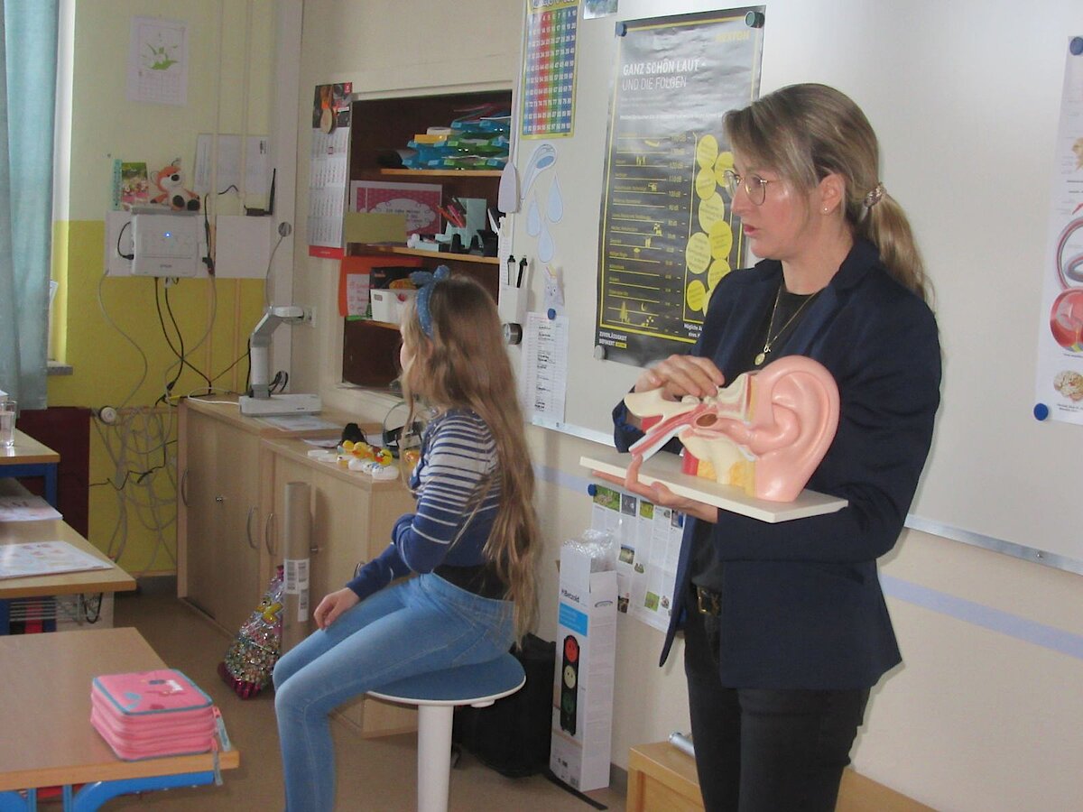 Frau Wolf (HNO-Ärztin) und Frau Klinger (Hörgeräteakustikerin) waren zu Gast und gaben den Kindern zu den Sinnesorganen Ohr und Nase wichtige Informationen.