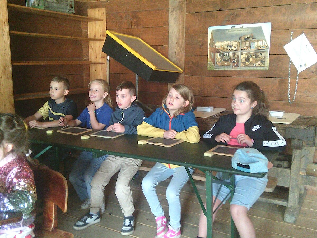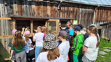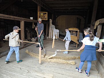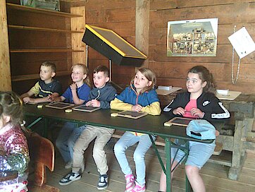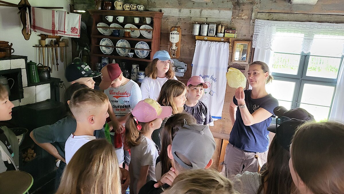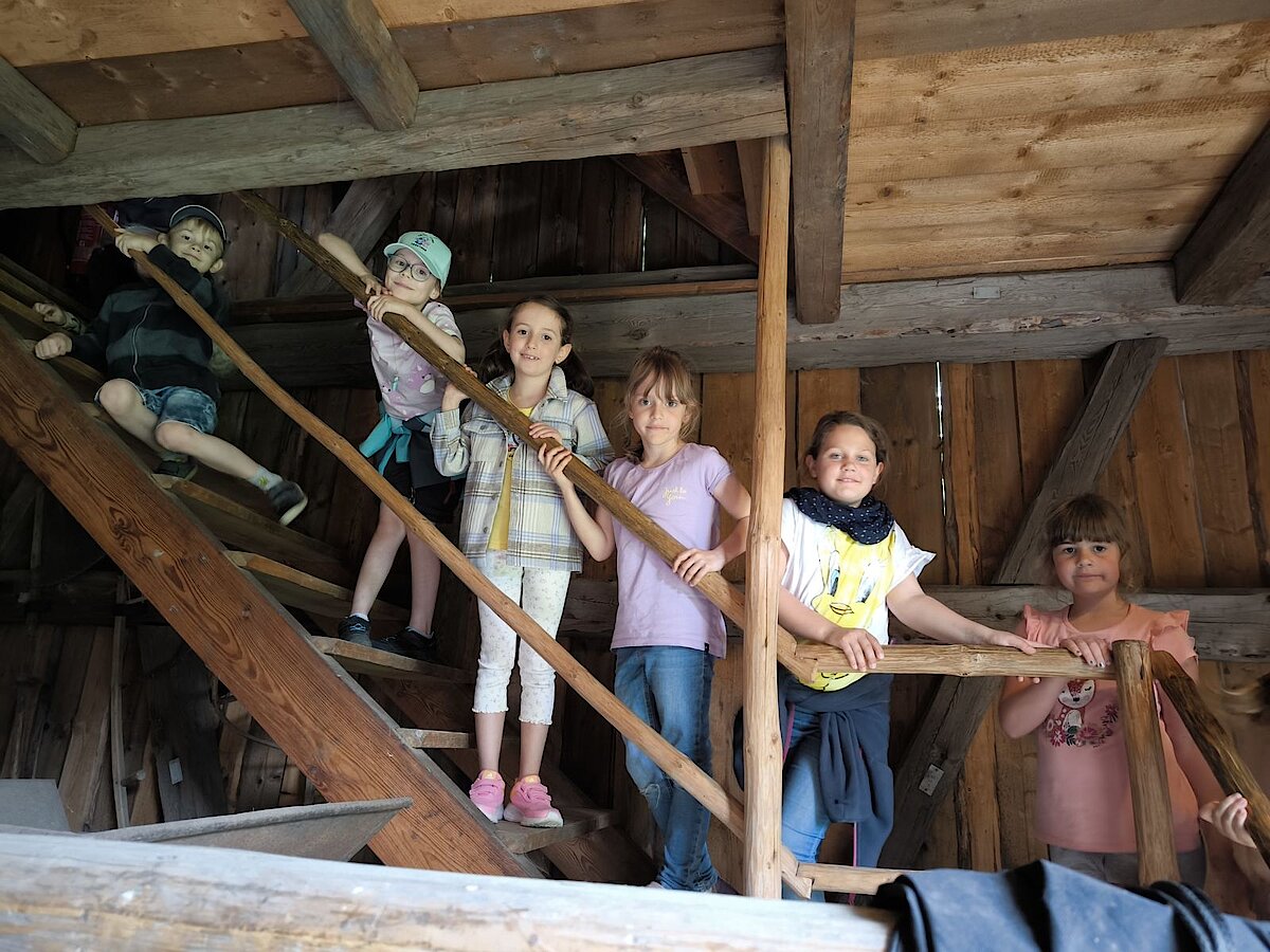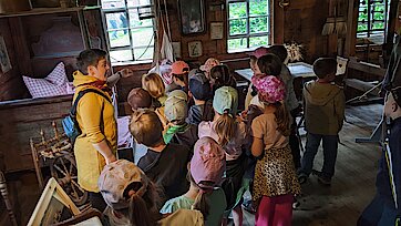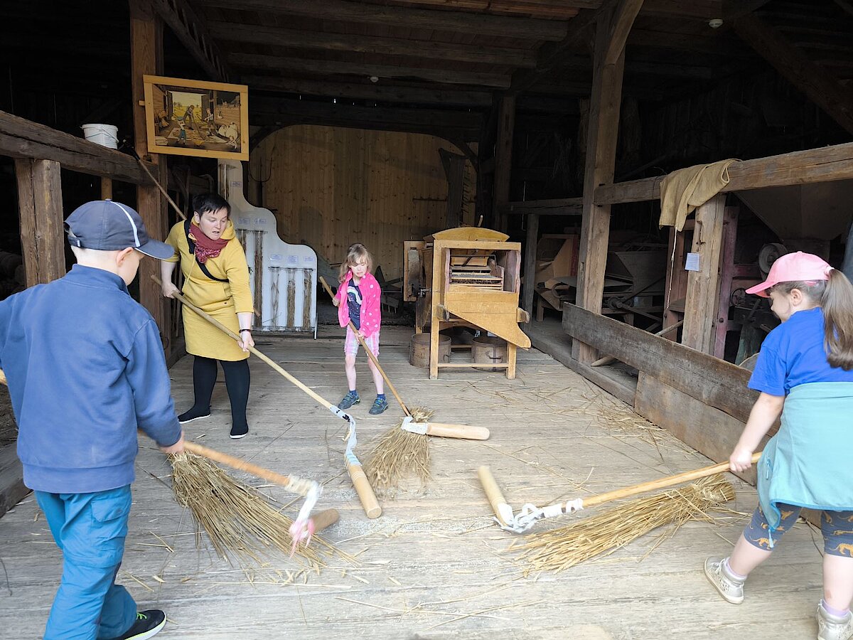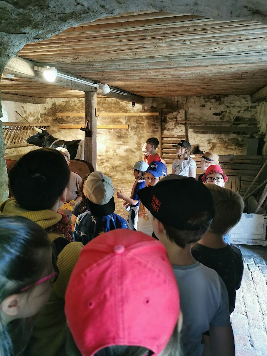 In der Zwischenzeit schauten sich die Kinder ein altes Wohnstallhaus an und waren erstaunt als sie hörten, dass früher die Tiere und die Menschen unter einem Dach lebten. Auch, dass die Familien nur einen Raum hatten, in dem sie schliefen, arbeiteten und aßen, war für manche Kinder kaum vorstellbar.