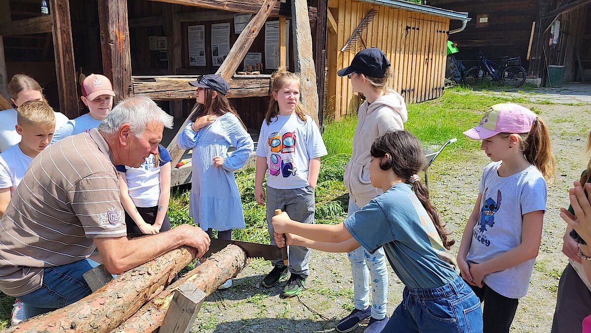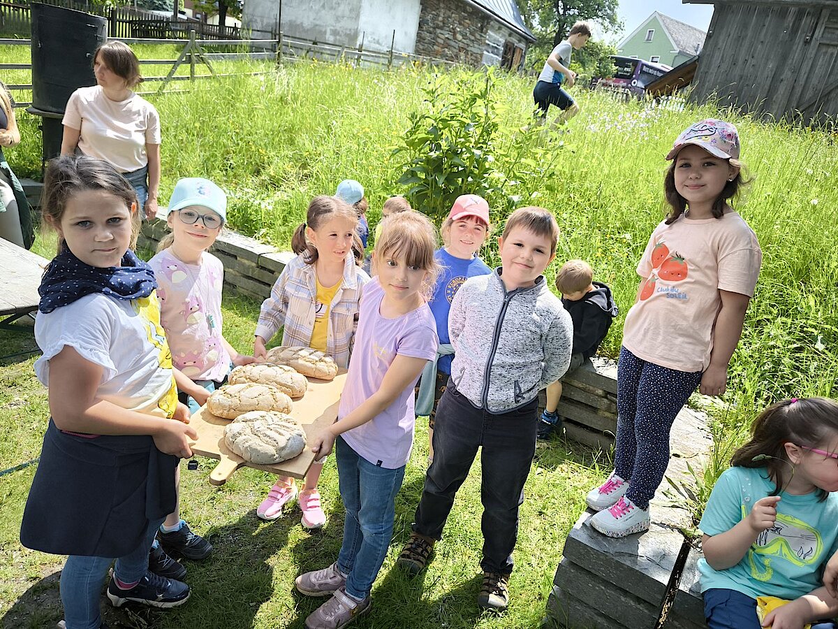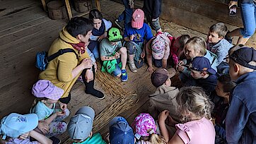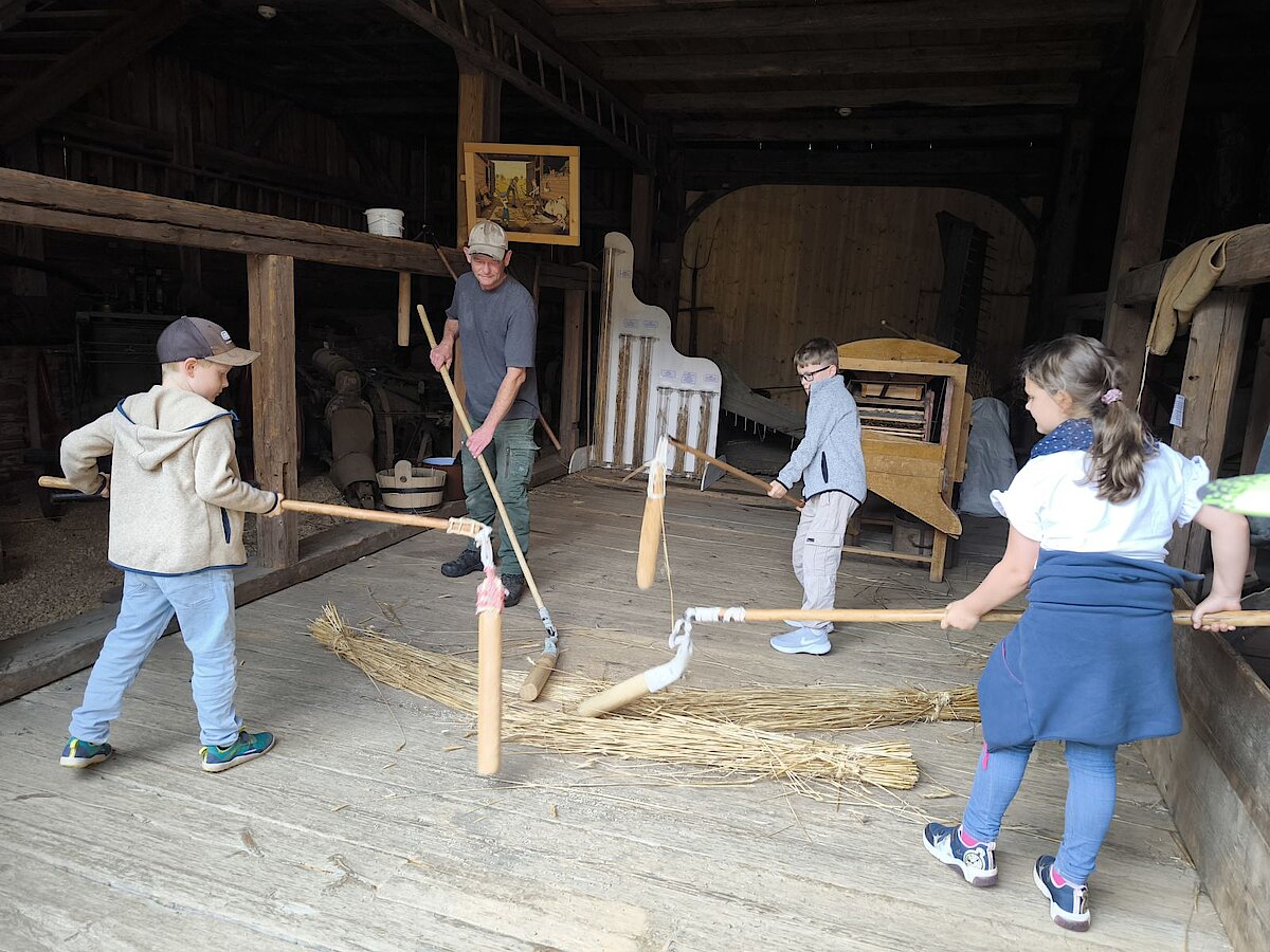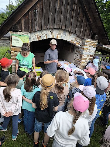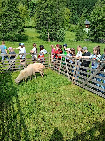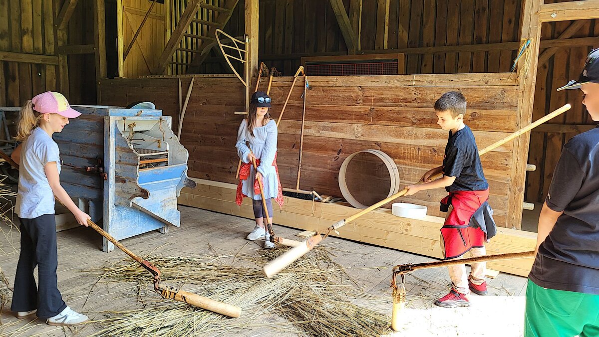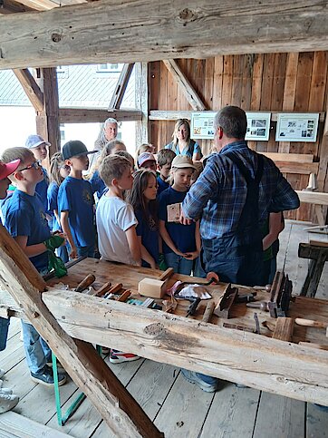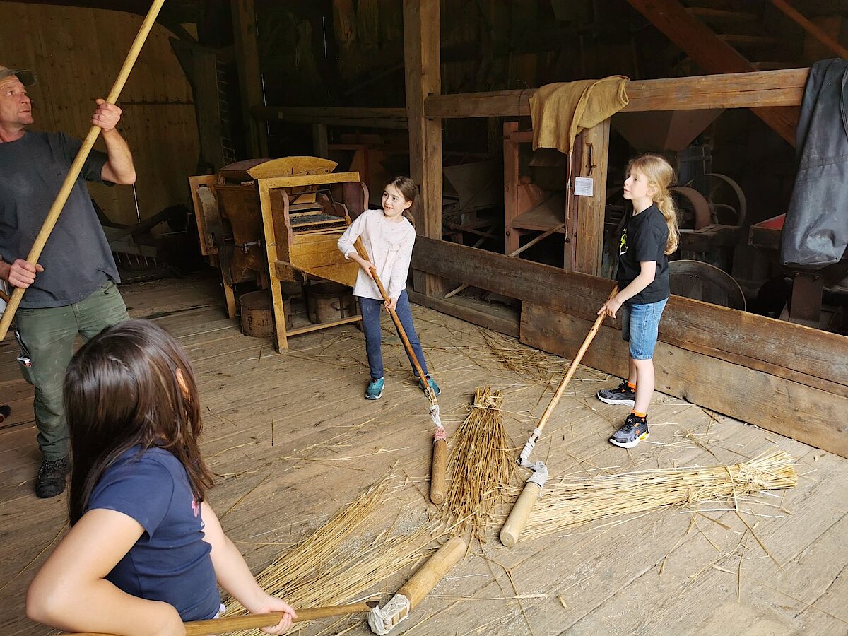In der Zwischenzeit schauten sich die Kinder ein altes Wohnstallhaus an und waren erstaunt als sie hörten, dass früher die Tiere und die Menschen unter einem Dach lebten. Auch, dass die Familien nur einen Raum hatten, in dem sie schliefen, arbeiteten und aßen, war für manche Kinder kaum vorstellbar.