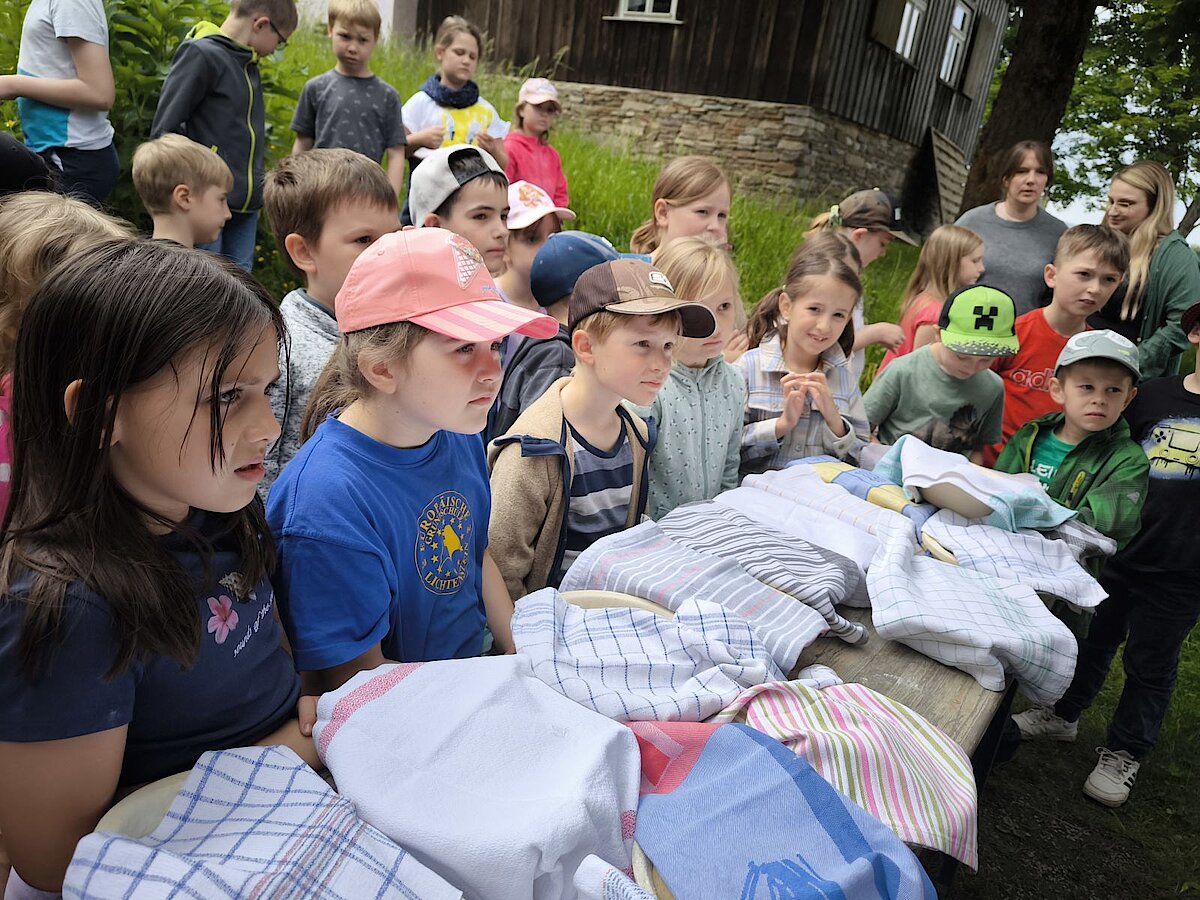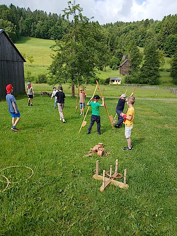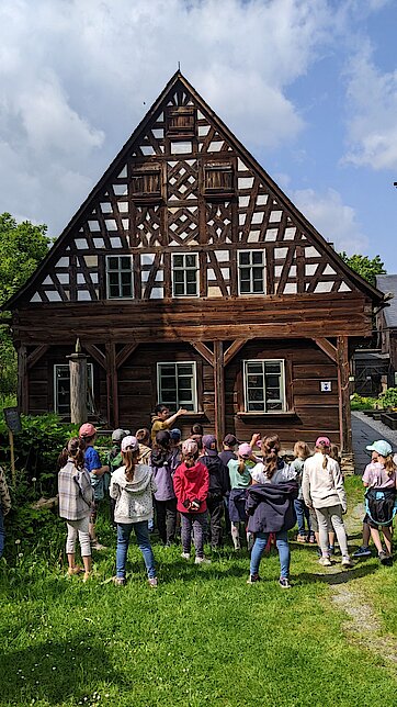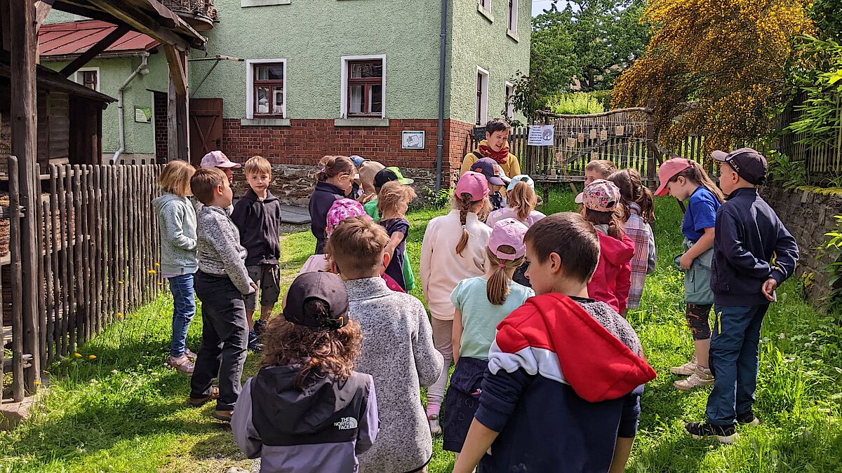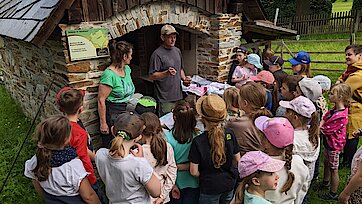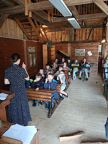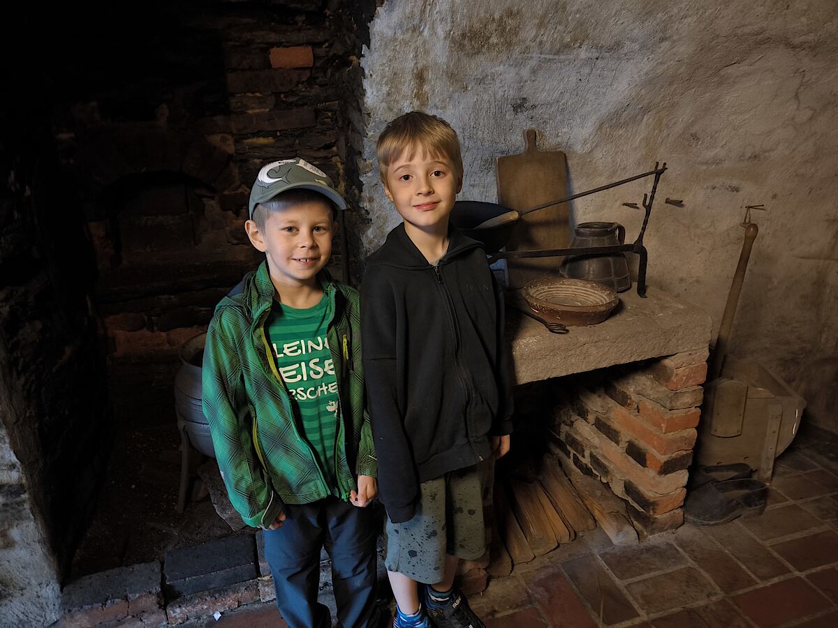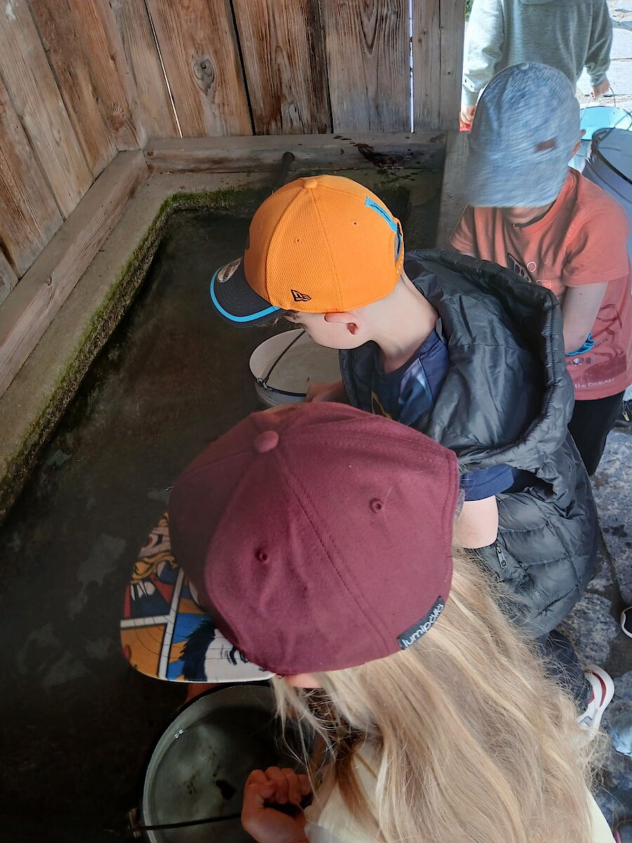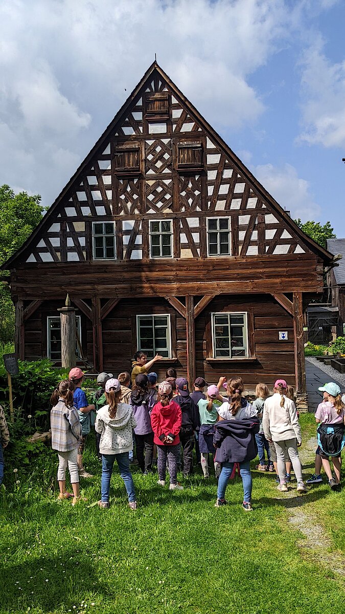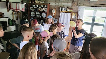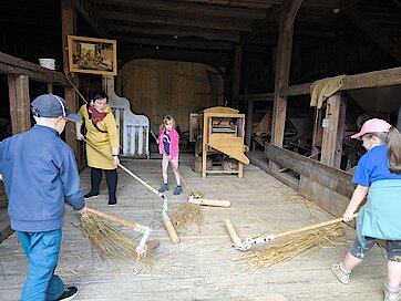 In der Zwischenzeit schauten sich die Kinder ein altes Wohnstallhaus an und waren erstaunt als sie hörten, dass früher die Tiere und die Menschen unter einem Dach lebten. Auch, dass die Familien nur einen Raum hatten, in dem sie schliefen, arbeiteten und aßen, war für manche Kinder kaum vorstellbar.