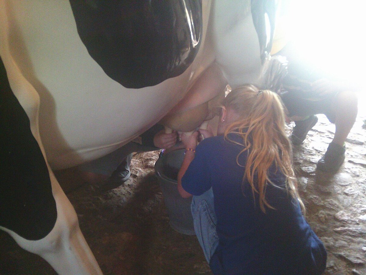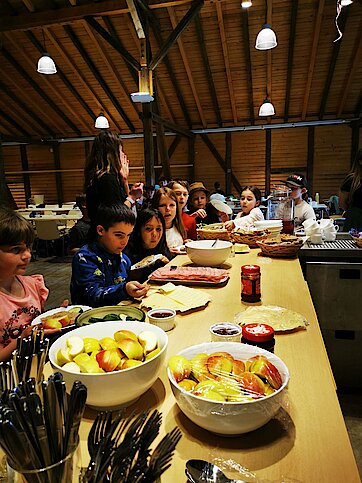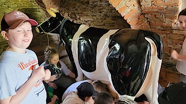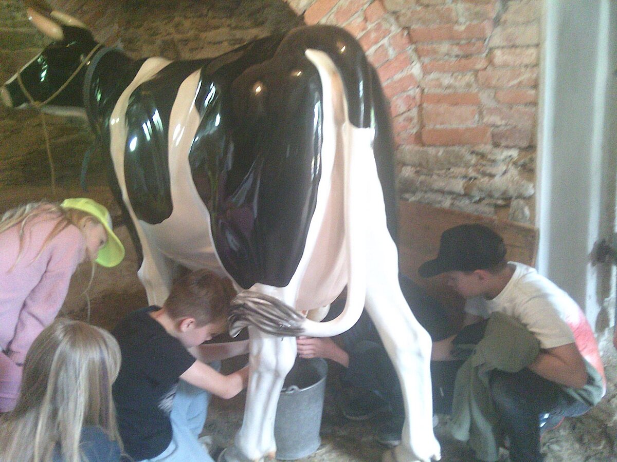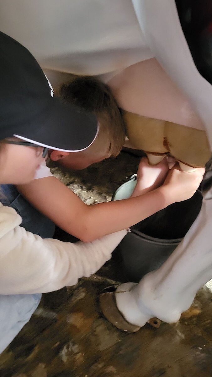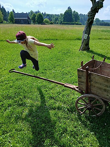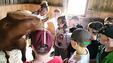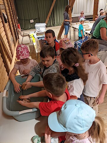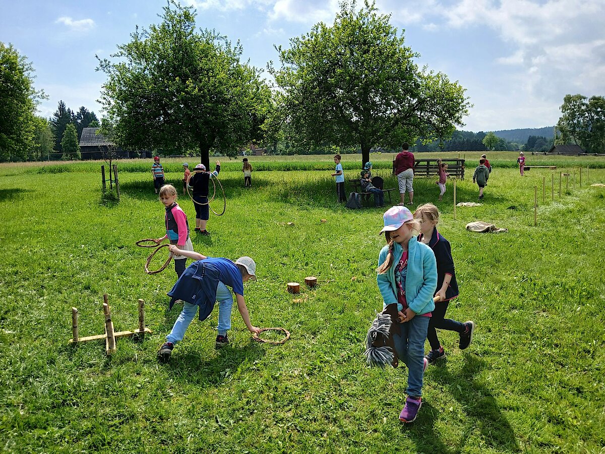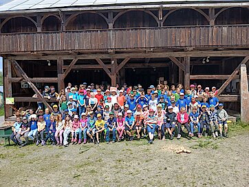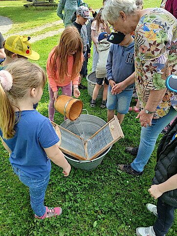 In der Zwischenzeit schauten sich die Kinder ein altes Wohnstallhaus an und waren erstaunt als sie hörten, dass früher die Tiere und die Menschen unter einem Dach lebten. Auch, dass die Familien nur einen Raum hatten, in dem sie schliefen, arbeiteten und aßen, war für manche Kinder kaum vorstellbar.