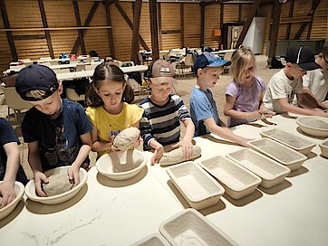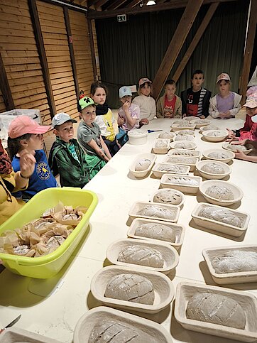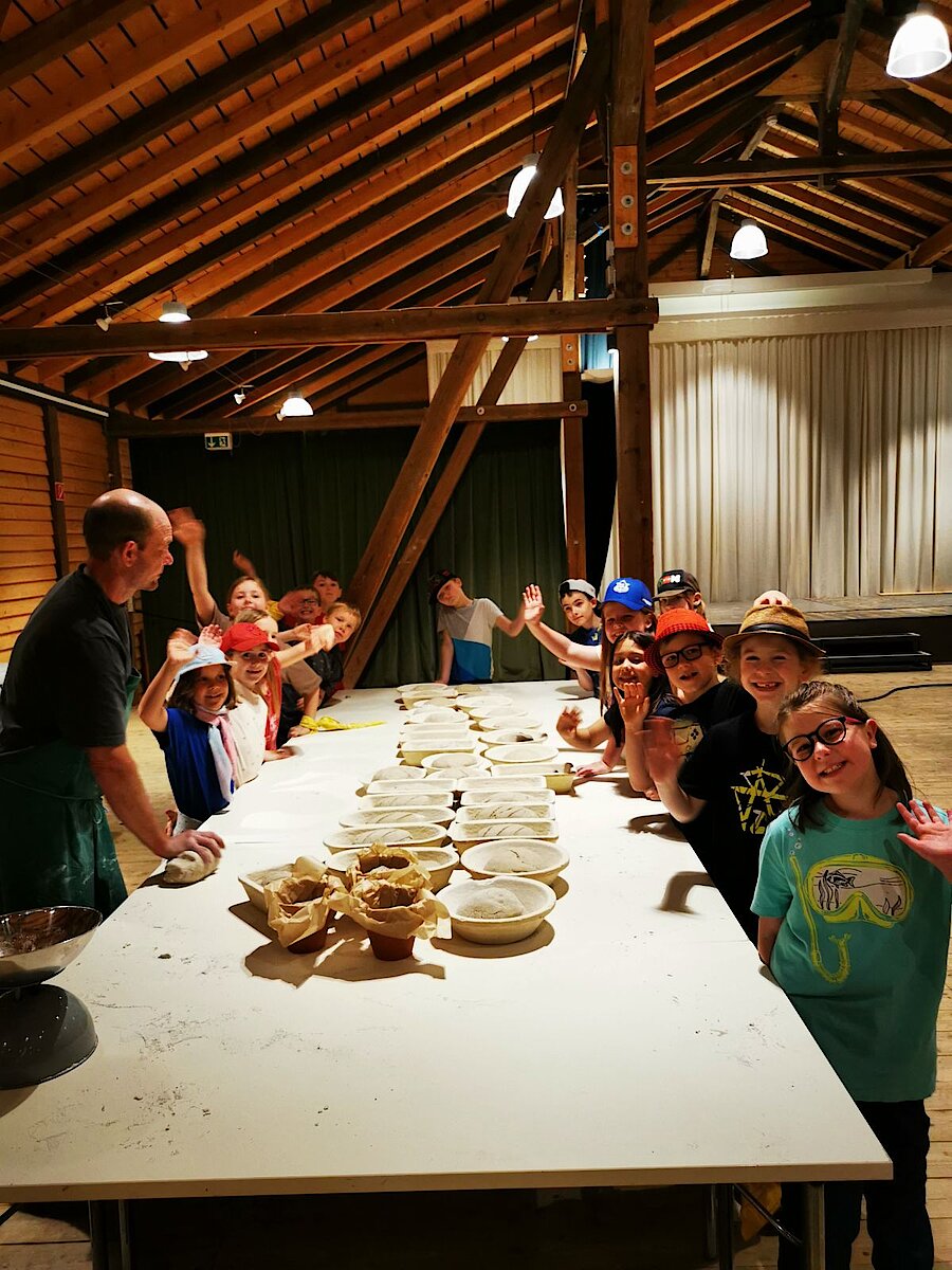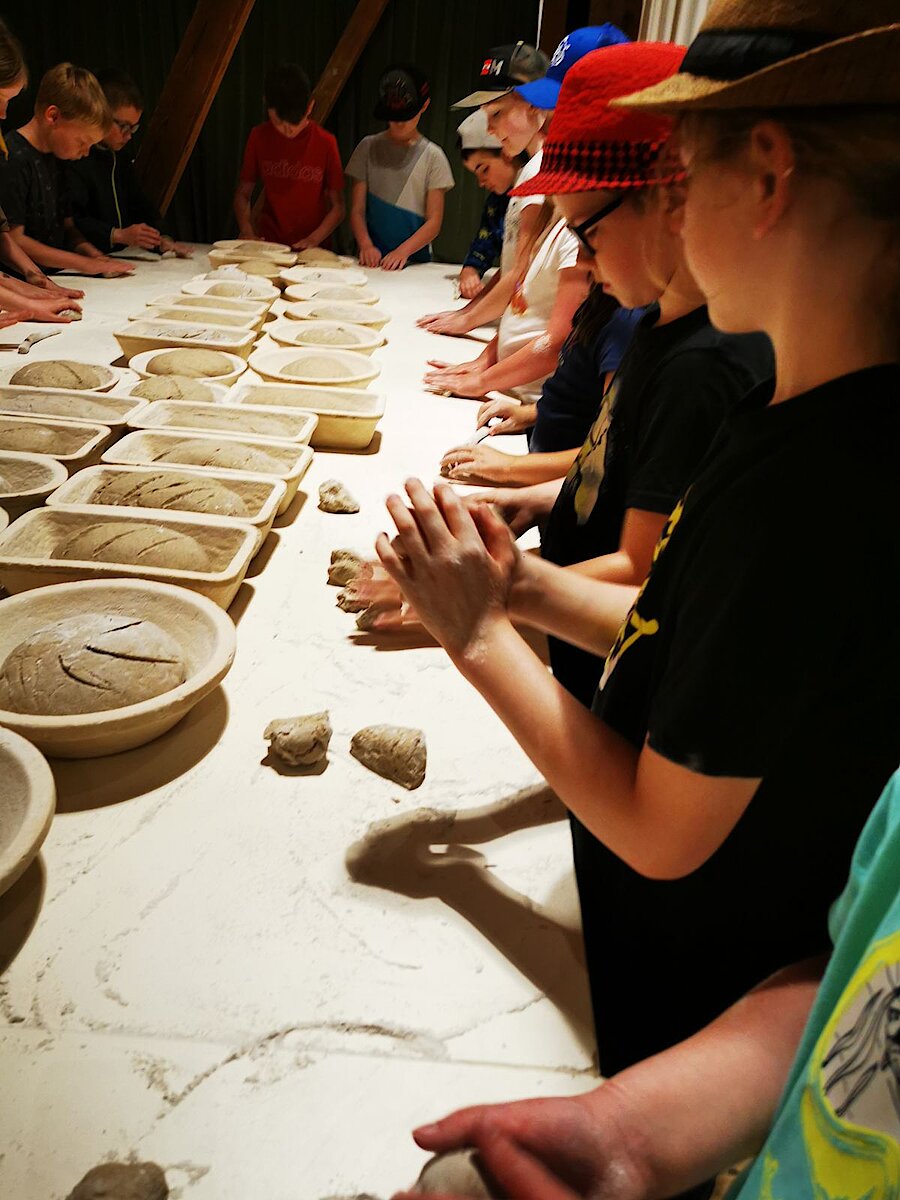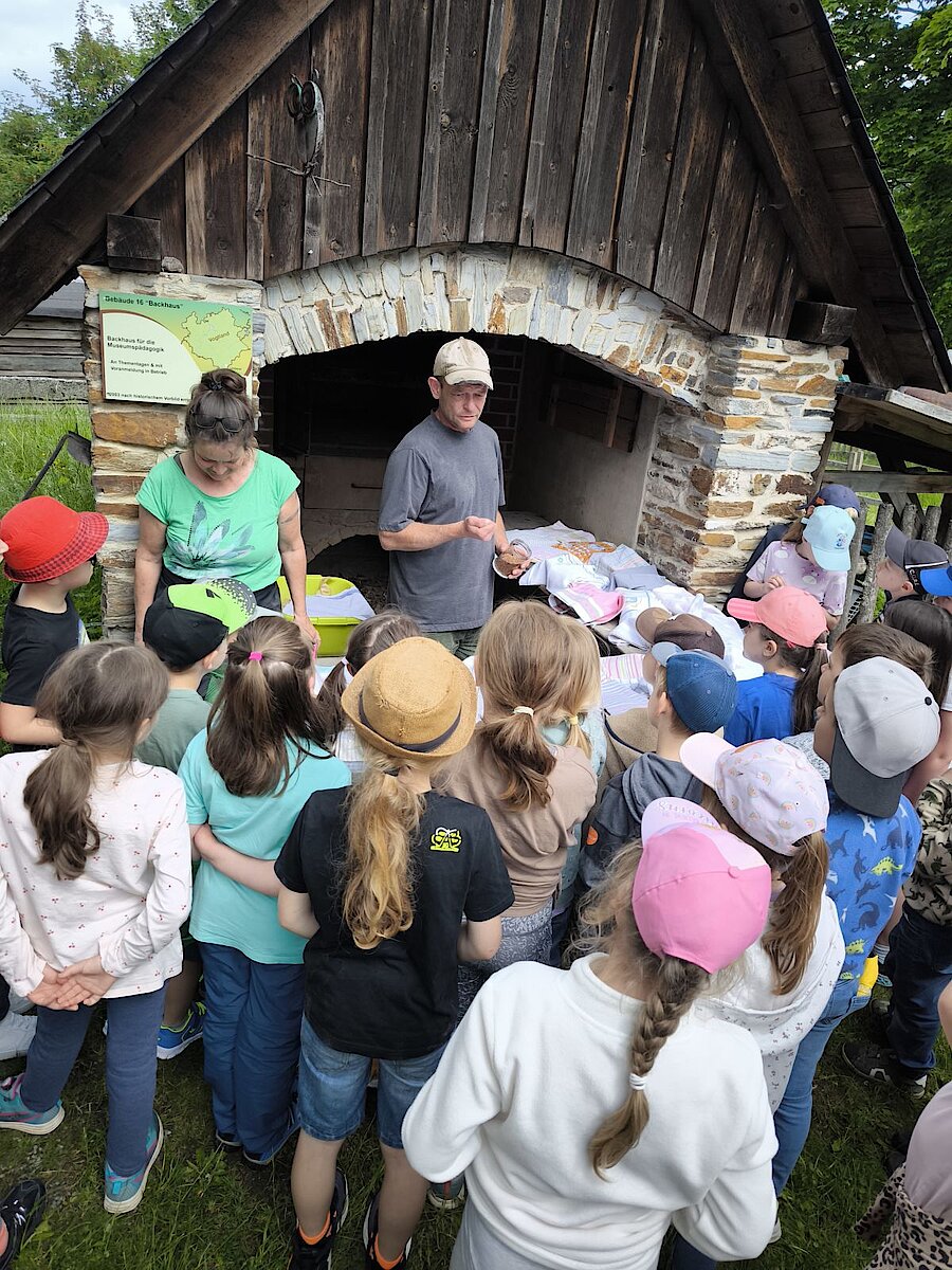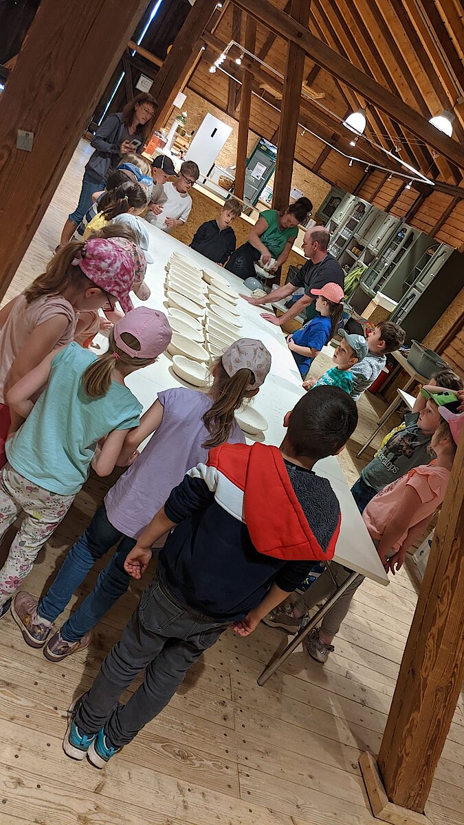In der großen Kulturtenne des Museums war schon alles für die Kinder vorbereitet. Gärkörbchen standen auf einem großen Tisch und auch der Teig für viele Roggenmischbrote wartete darauf, verarbeitet zu werden. Unter Anleitung formte eine Klasse daraus Brote und die andere Klasse Brezeln. Es hat allen Kindern sichtlich Spaß gemacht, die Hände im Mehl zu „baden“ sowie den Brotteig zu kneten und in die richtige Form zu bringen. Anschließend brachten sie gemeinsam alles zum schon angeheizten Backofen auf dem Gelände, konnten zuschauen, wie die Brote in den Ofen geschoben wurden und erfuhren, wie man ohne Thermometer herausfindet, welche Temperatur in so einem Holzofen herrscht. Spannend! Lassen Sie es sich einfach einmal erzählen ;-).