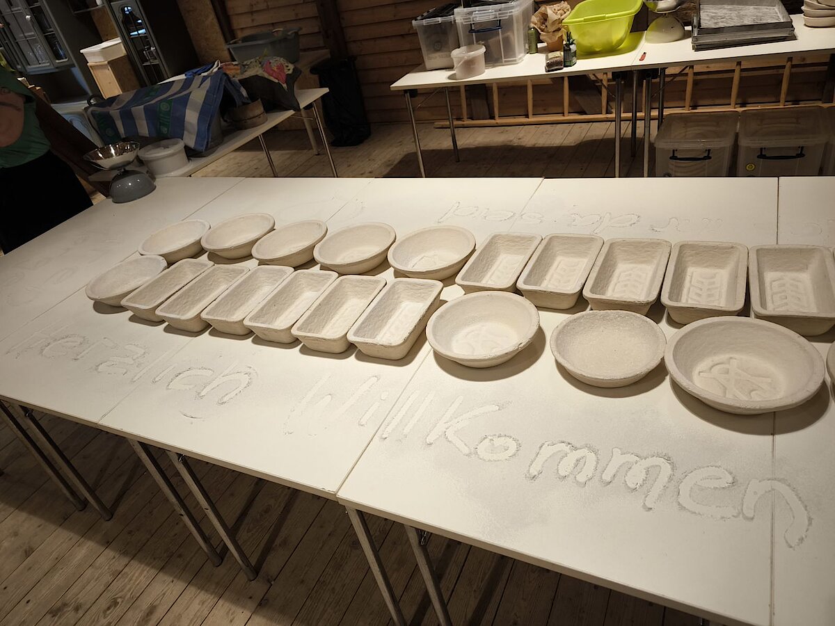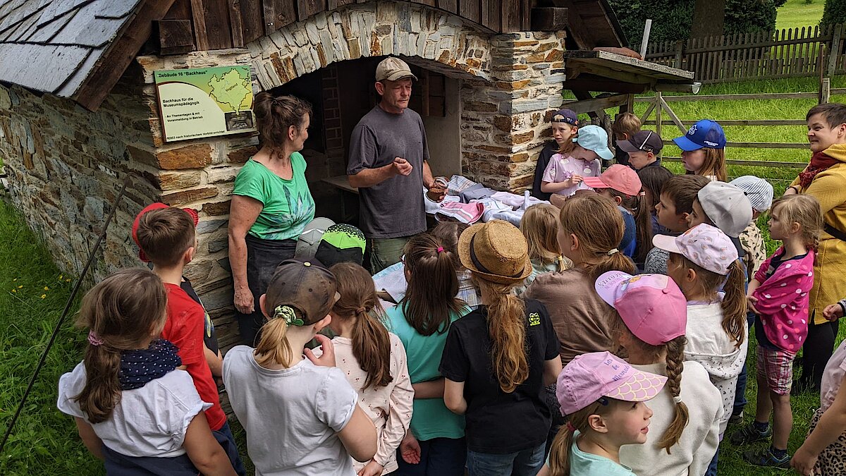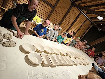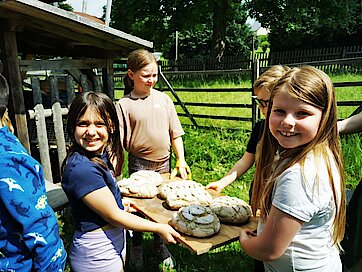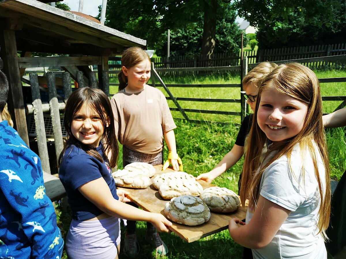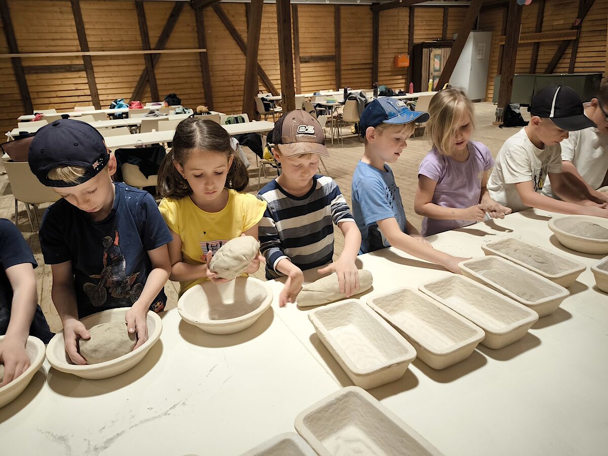 In der großen Kulturtenne des Museums war schon alles für die Kinder vorbereitet. Gärkörbchen standen auf einem großen Tisch und auch der Teig für viele Roggenmischbrote wartete darauf, verarbeitet zu werden. Unter Anleitung formte eine Klasse daraus Brote und die andere Klasse Brezeln. Es hat allen Kindern sichtlich Spaß gemacht, die Hände im Mehl zu „baden“ sowie den Brotteig zu kneten und in die richtige Form zu bringen. Anschließend brachten sie gemeinsam alles zum schon angeheizten Backofen auf dem Gelände, konnten zuschauen, wie die Brote in den Ofen geschoben wurden und erfuhren, wie man ohne Thermometer herausfindet, welche Temperatur in so einem Holzofen herrscht. Spannend! Lassen Sie es sich einfach einmal erzählen ;-).