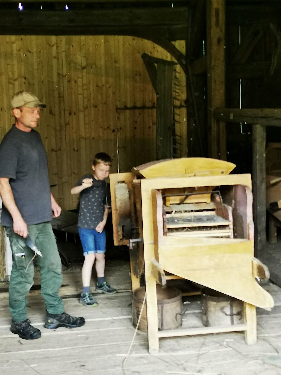 An einer weiteren Station probierten alle Mädchen und Jungen den Umgang mit einem Dreschflegel aus. So konnten sie sich ein wenig in die Menschen früher hineinversetzen und erfahren, welche Arbeit sie leisten mussten, um die Körner aus dem Getreide zu dreschen. Anschließend wurde mit einer Fegemühle die Spreu von den Körnern getrennt und selbstverständlich durfte jedes Kind auch einmal kurbeln :-).
