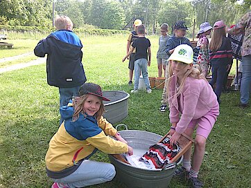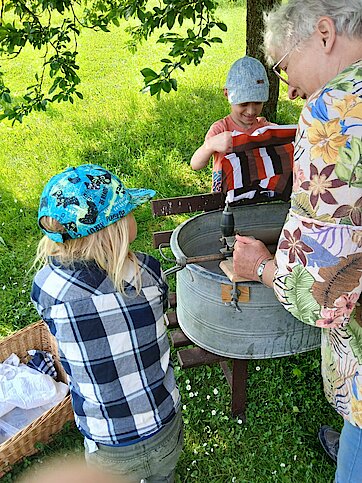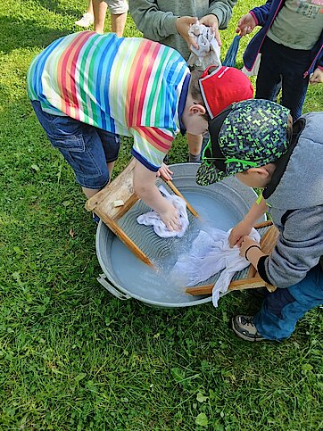Beim Wäschewaschen pumpten die Kinder das Wasser aus dem Brunnen und versuchten mit Waschbrett, Bürste und Kernseife hartnäckige Flecken aus Kleidungsstücken herauszubekommen.
