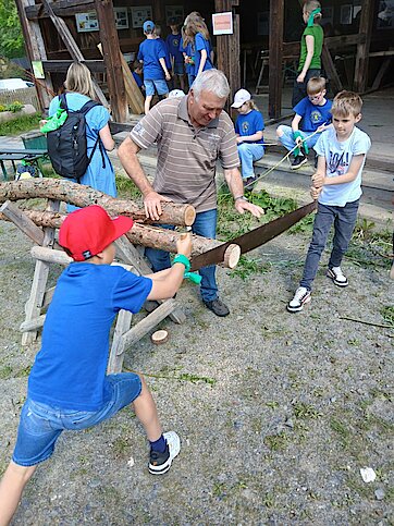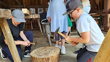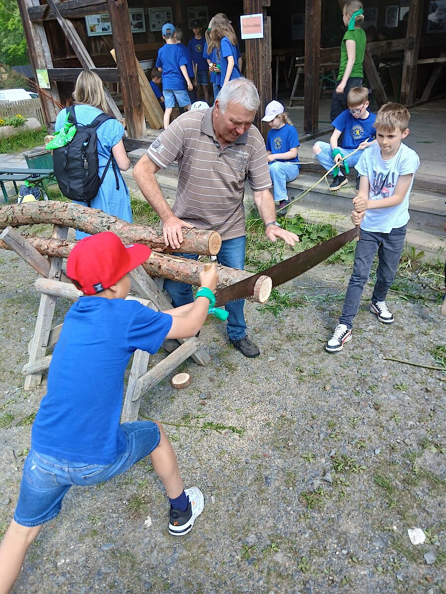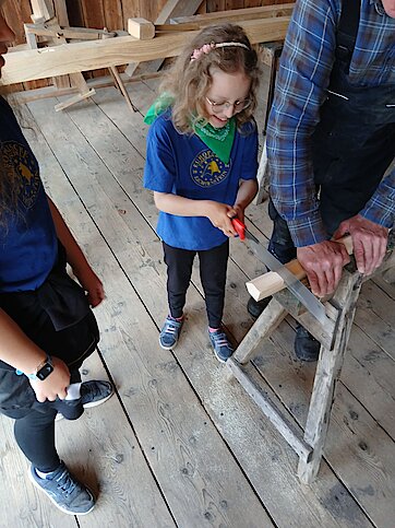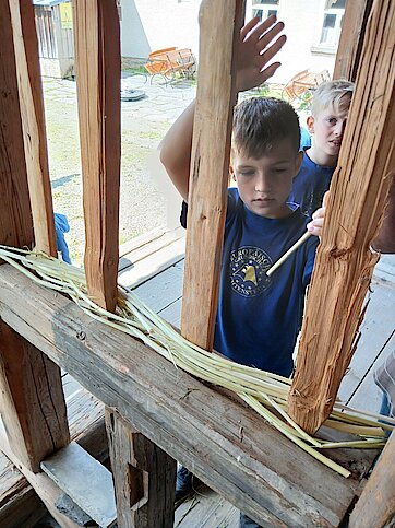 Kleine Baumeister und Baumeisterinnen lernten verschiedene Techniken des Fachwerkbaus kennen. Sie durften sägen, hämmern, schnitzen, flechten und sogar ihr eigenes kleines Fachwerkhaus gestalten.