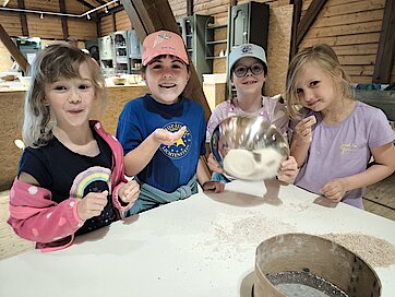 Die Klassen 1b und 2b waren nach kurzer Weiterreise im Museumsteil in Landwüst angekommen und starteten nach einem kurzen Frühstück auch schon in das geplante Programm: „Brot backen - Vom Korn bis zum täglichen Brot“.