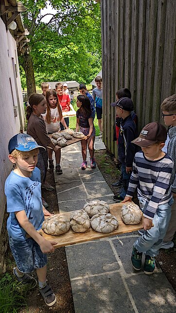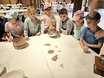 Zurück in der Kulturtenne schauten wir uns gemeinsam mit einer Mitarbeiterin verschiedene Getreidesorten an. Die Kinder erfuhren, was „Vollkorn“ bedeutet; wussten viele Produkte, die aus Getreide hergestellt werden; durften Getreidekörner zu Mehl mahlen und das Wichtigste: auch einmal naschen. Apropos naschen, das Brot im Ofen war in der Zwischenzeit fertig. Gemeinsam gingen wir also alle zum Backofen und auf großen Holzbrettern trugen die Kinder die köstlich duftenden Brote zurück in die Tenne.