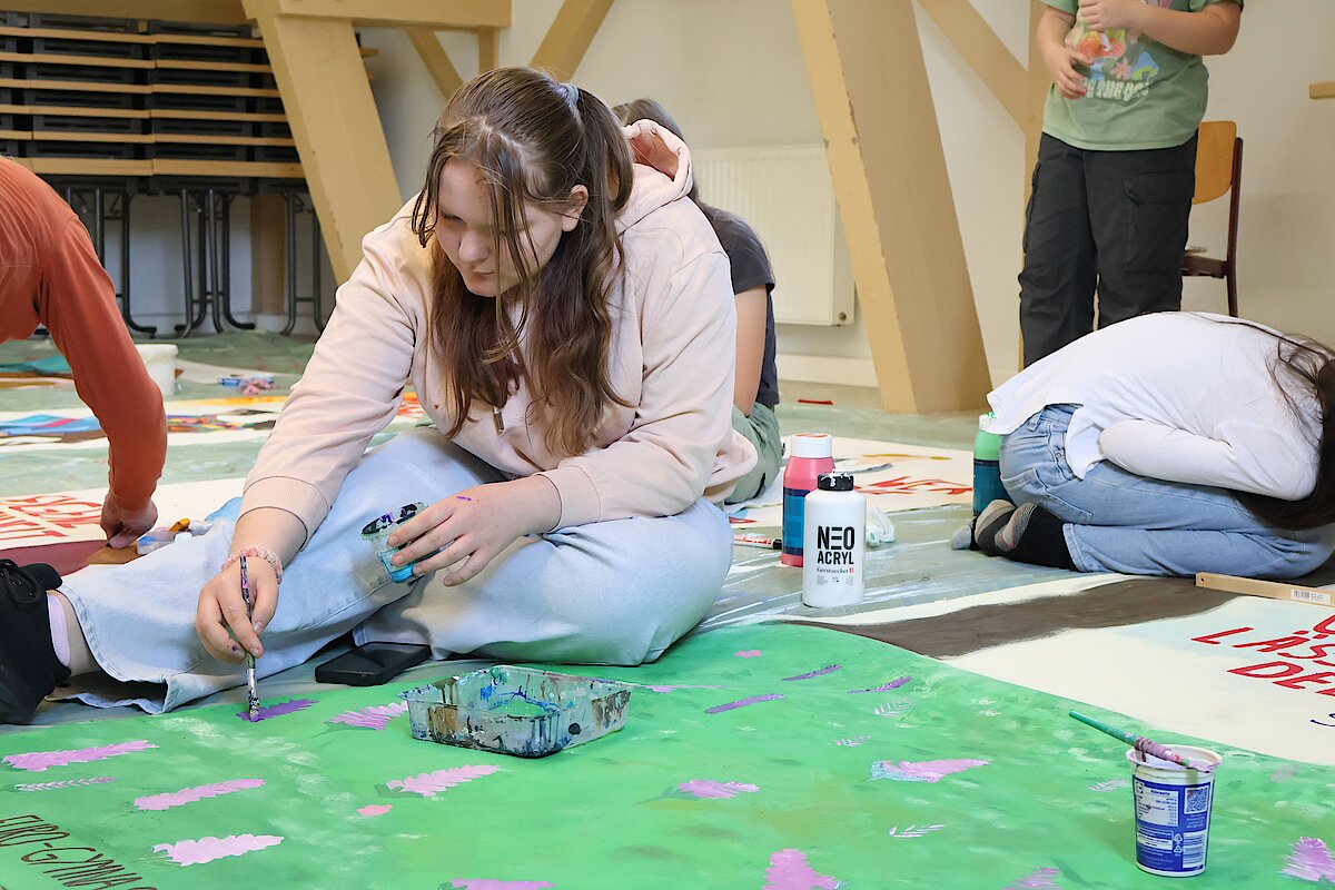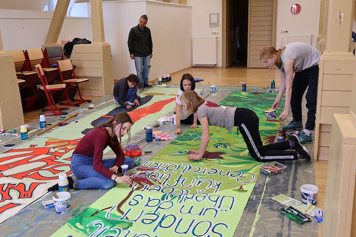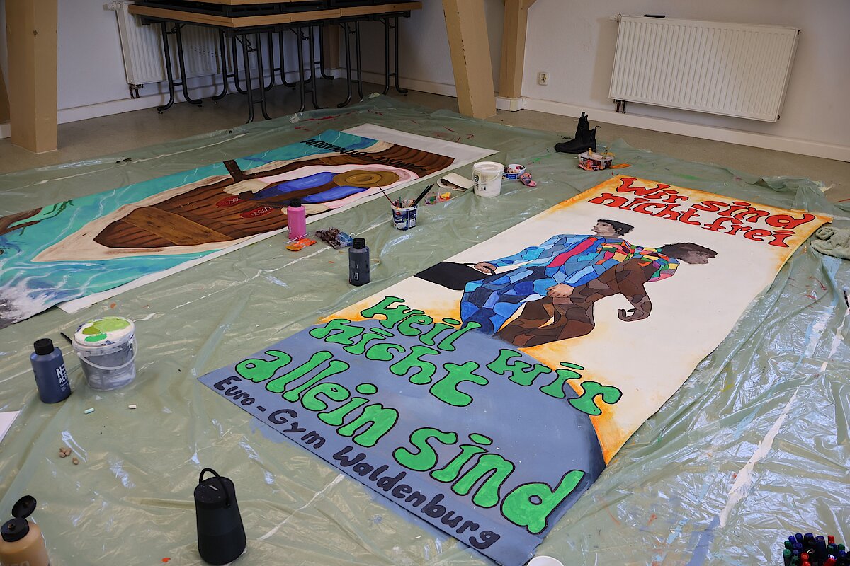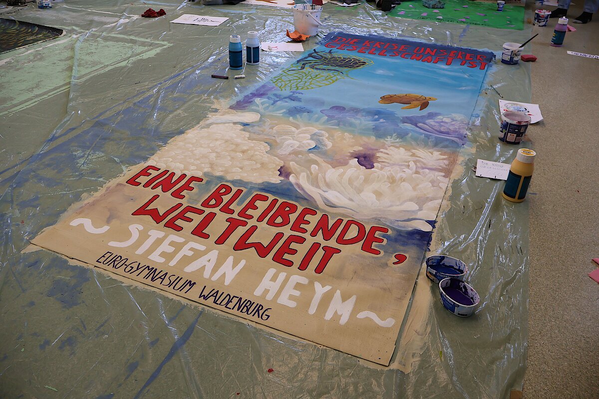 Begleitet von zwei erfahrenen Künstlern, Marian Kretschmer und Gerald Richter entwickelten die Teilnehmenden eigene Bildsprachen, setzten sich mit Heyms Texten auseinander und fanden kreative Ausdrucksformen für aktuelle Fragestellungen. Das Ergebnis: kraftvolle und nachdenklich stimmende Kunstwerke, die sowohl im Schulalltag als auch darüber hinaus sichtbar und wirksam sind. Zum diesjährigen Schulfest schmückten die Banner das Schulgebäude und konnten von allen Besuchern bewundert werden