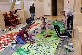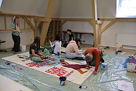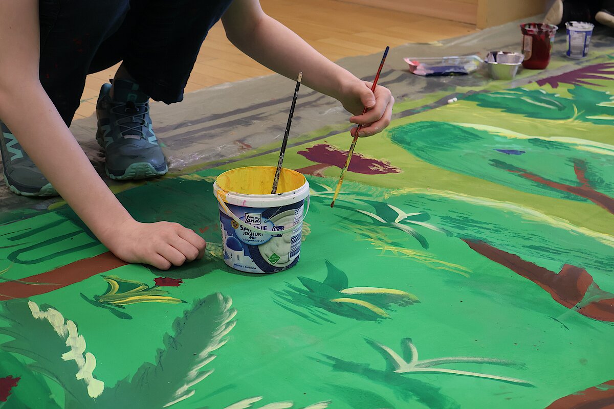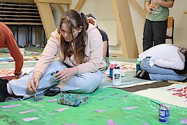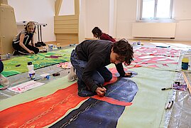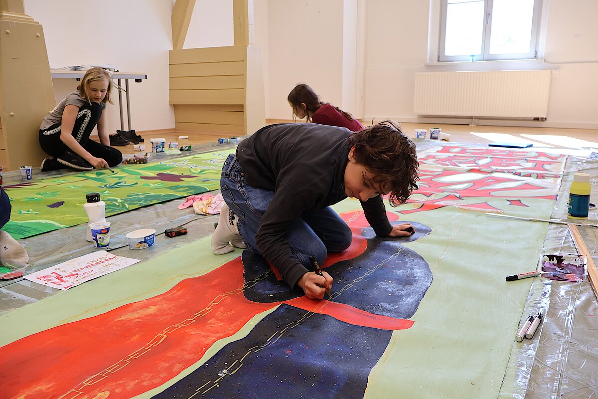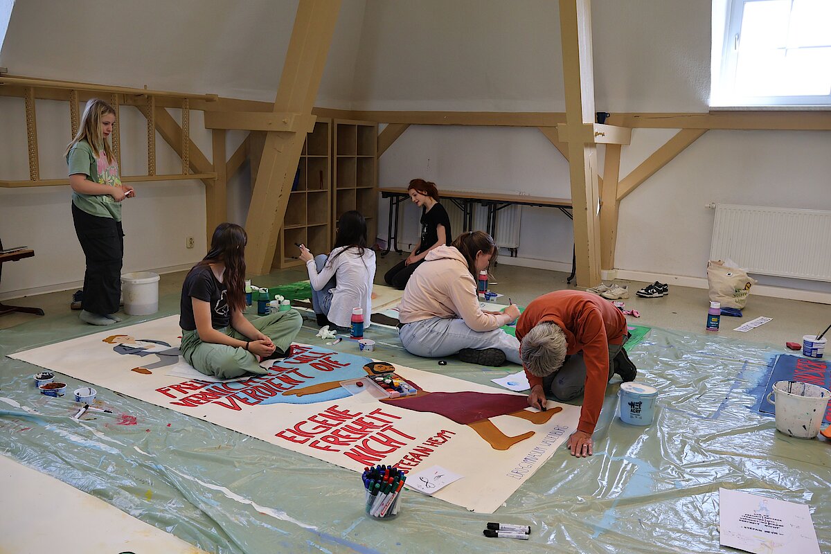 Begleitet von zwei erfahrenen Künstlern, Marian Kretschmer und Gerald Richter entwickelten die Teilnehmenden eigene Bildsprachen, setzten sich mit Heyms Texten auseinander und fanden kreative Ausdrucksformen für aktuelle Fragestellungen. Das Ergebnis: kraftvolle und nachdenklich stimmende Kunstwerke, die sowohl im Schulalltag als auch darüber hinaus sichtbar und wirksam sind. Zum diesjährigen Schulfest schmückten die Banner das Schulgebäude und konnten von allen Besuchern bewundert werden