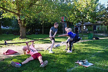 Hier konnten Kräfte gemessen, Geschicklichkeit geübt, Teamgeist gefördert oder aber Vertrauen untereinander geschult werden. Nach acht Stationen gab es eine Frühstückspause, die für einige gerade noch rechtzeitig kam, denn es war hier und da ganz schön anstrengend! Frisch gestärkt nahmen die Kinder nun die restlichen Stationen in Angriff und wurden dann zum Schluss mit einem wohlverdienten Eis belohnt.