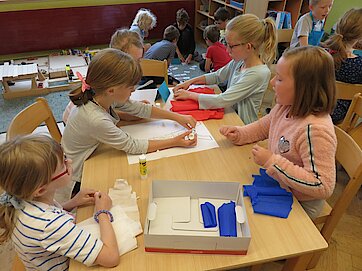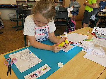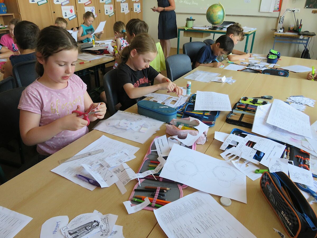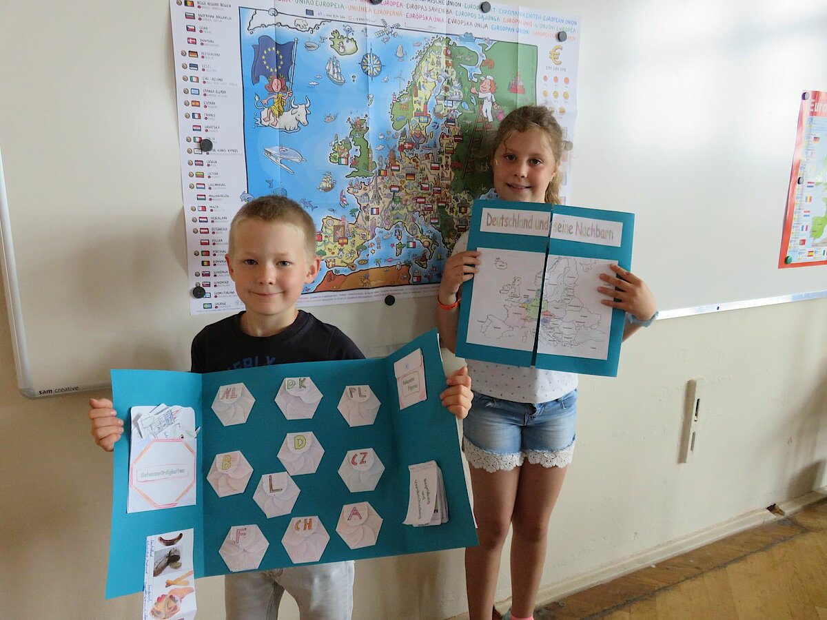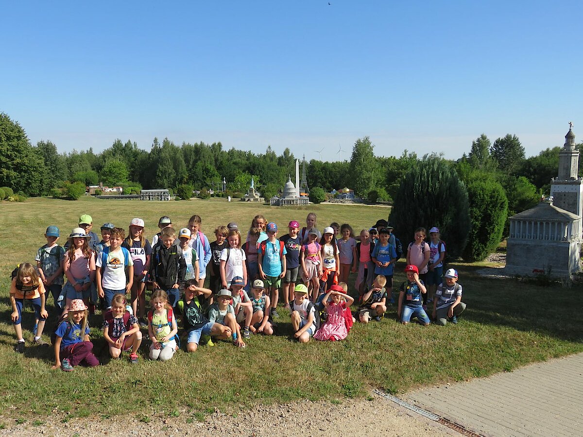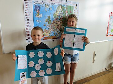 „Im Norden grenzt Deutschland an Dänemark, im Süden an Österreich und Schweiz, im Osten an Polen und an Tschechien im Westen an Benelux und Frankreich.“* Der Text dieses Kinderliedes begleitete uns durch die gesamte Projektwoche, die wir am Montag mit der Anfertigung eines Lapbooks über „Deuschland und seine Nachbarländer“ begannen. Wie groß ist das jeweilige Land, wie viele Einwohner hat es, welche berühmte Sehenswürdigkeit gibt es und wie heißt eigentlich die Hauptstadt? Diese und noch weitere Informationen wurden darin festgehalten. Im weiteren Verlauf der Woche stellten die Kinder ein Memory her, bauten das Atomium nach und fertigten eine Windmühle an, was ihnen besonders viel Vergnügen bereitete. In der Miniwelt, die wir gemeinsam mit der Klasse 2a besuchten, fanden sie viele Bauwerke aus Deutschland und seinen Nachbarländern im Kleinformat wieder. Das war ein spannender Ausflug, denn die Kinder bekamen einen Suchauftrag und durften teilweise allein durch den Park laufen, um die Bauwerke zu finden. Zum Abschluss der Projektwoche gestaltete jedes Kind einen Schuhkarton mit seinem Lieblingsland und der Höhepunkt war selbstverständlich unser großartiges Sommerfest am Freitag, auf das sich alle unglaublich sehr gefreut haben.