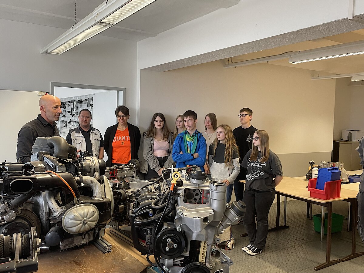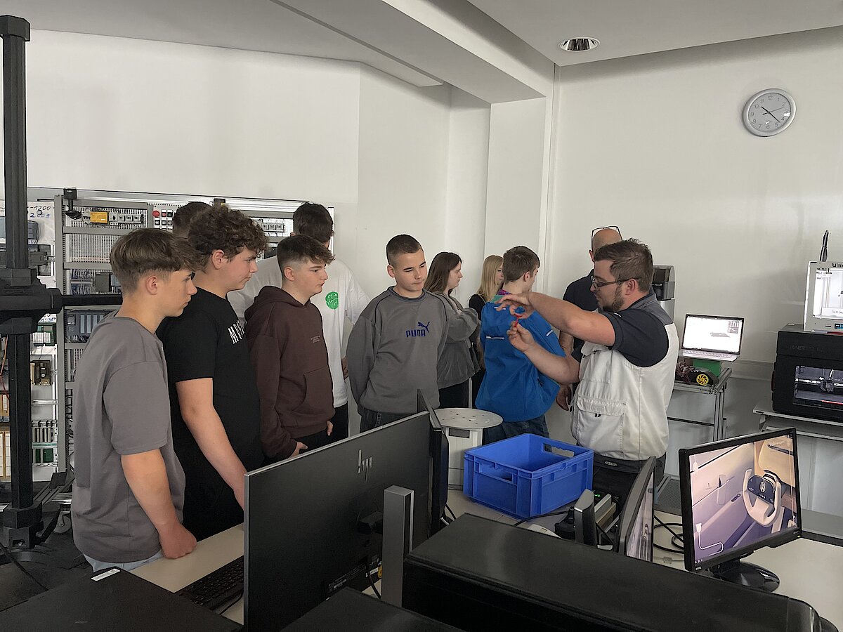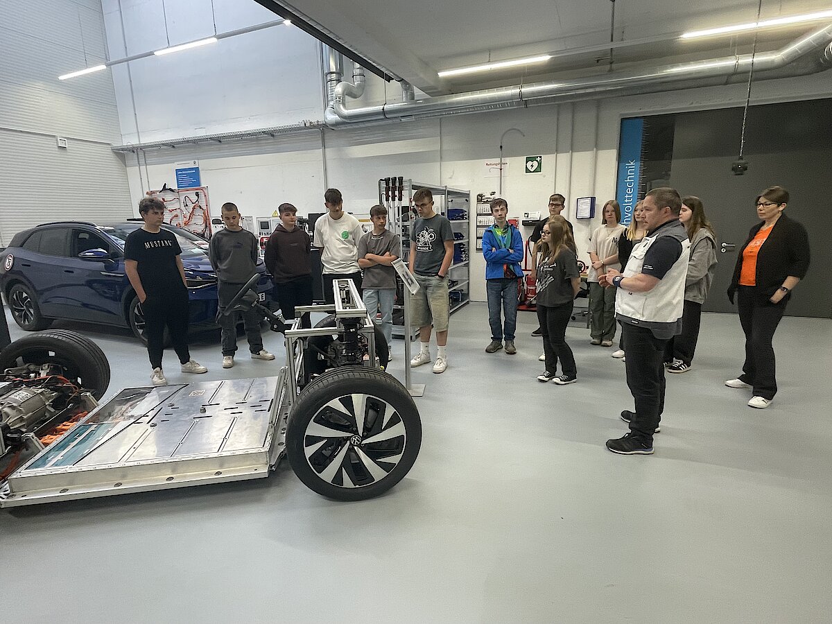 Nach langem Warten erreichte uns dann die frohe Botschaft: Wir haben gewonnen! 26 Schüler der 8. Klassen durften mitfahren. Mit einem gecharterten Sonderbus von VW wurden die Jungs und Mädels am Mittwoch, dem 29.05.2024 kurz vor 9 Uhr in Waldenburg abgeholt und zur 1. Station des Tages nach Zwickau gefahren. Im VW-Bildungsinstitut wurden den Schülern die Berufsfelder Kfz-Technik und Mechatronik/Elektro zunächst vorgestellt. Dabei besuchten sie die verschiedenen Ausbildungswerkstätten, wo die Azubis zuerst die Grundlagen ihres Berufes lernen und im Laufe ihrer Ausbildung durch Seminare auch in den Bereichen ihres Handwerks geschult werden. Hier hatten unsere Schüler auch die Möglichkeit, mit Azubis direkt ins Gespräch zu kommen und ihnen Fragen zu stellen. Hierbei erfuhren wir z.B., wie Hilfswerkzeuge selbst geplant und am 3D-Drucker hergestellt werden.