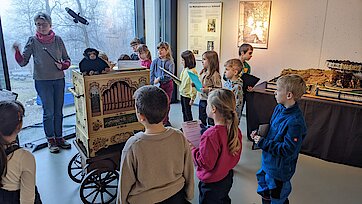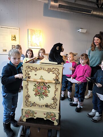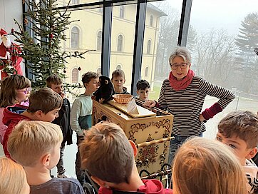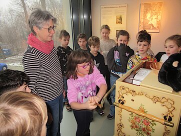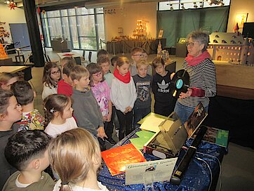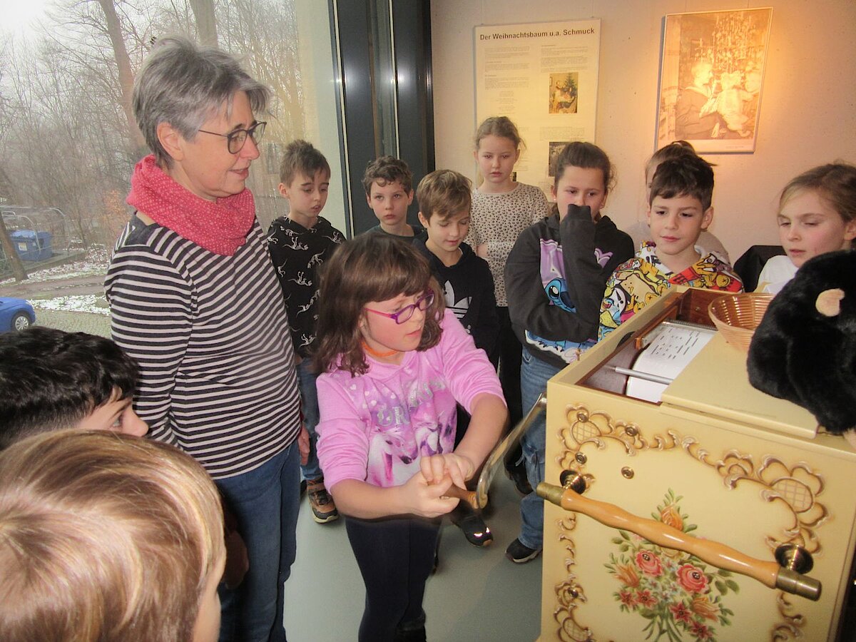 Jede Klasse bekam ein warmes Zimmer, in dem die Kinder frühstücken und sich aufhalten konnten. Im Stationsbetrieb erfuhren sie u. a. wie schwierig es ist, sich so auszudrücken, dass der Partner versteht, was er machen soll. Bei einer kleinen musikalischen Führung hörten sie sich an, wie die Musik klingt, die von einem Plattenspieler kommt und wie sie klingt, wenn ein Leierkasten spielt. Einige Kinder durften sogar selbst die Musik „ankurbeln“. Alle sahen sich die interessante Weihnachtsausstellung an und testeten ihr Wissen darüber in einem kleinen Quiz.
