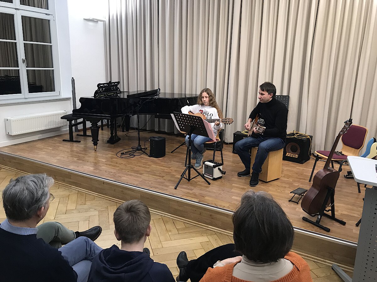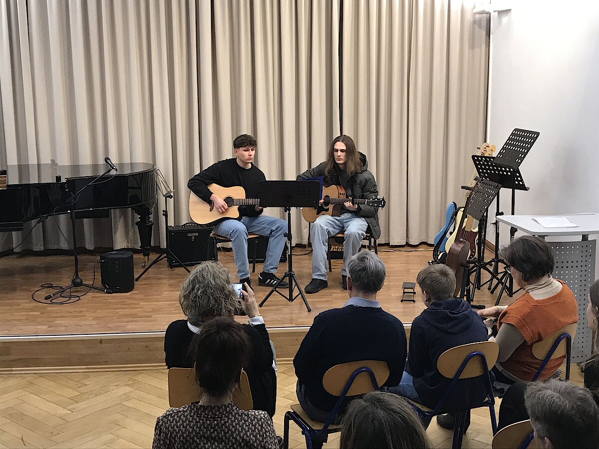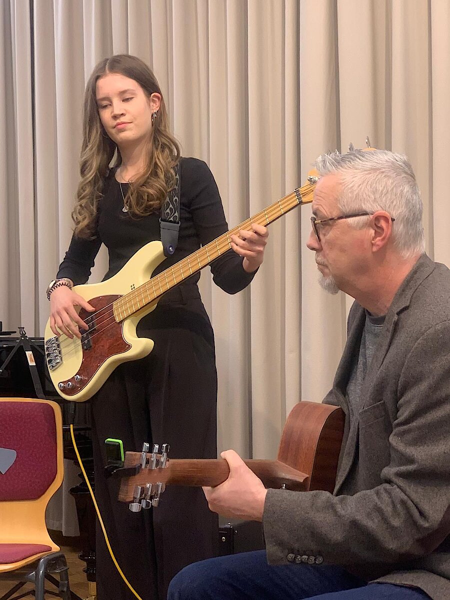 Auch wenn die Erkältungszeit einige geplante Darbietungen verhinderte, konnten sich die Zuhörerinnen und Zuhörer über ein abwechslungsreiches Programm freuen. Den Auftakt machte Abby Wesolek auf der Gitarre mit einem beeindruckenden Mix aus Ghostrider und The Riddle, begleitet von ihrem Gitarrenlehrer Frank Neubauer. Danach zeigte Anna Kewitsch ihr Können auf dem E-Bass mit einer gefühlvollen Jazz-Etüde.
