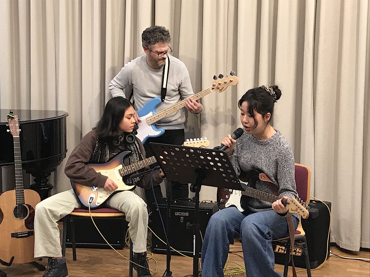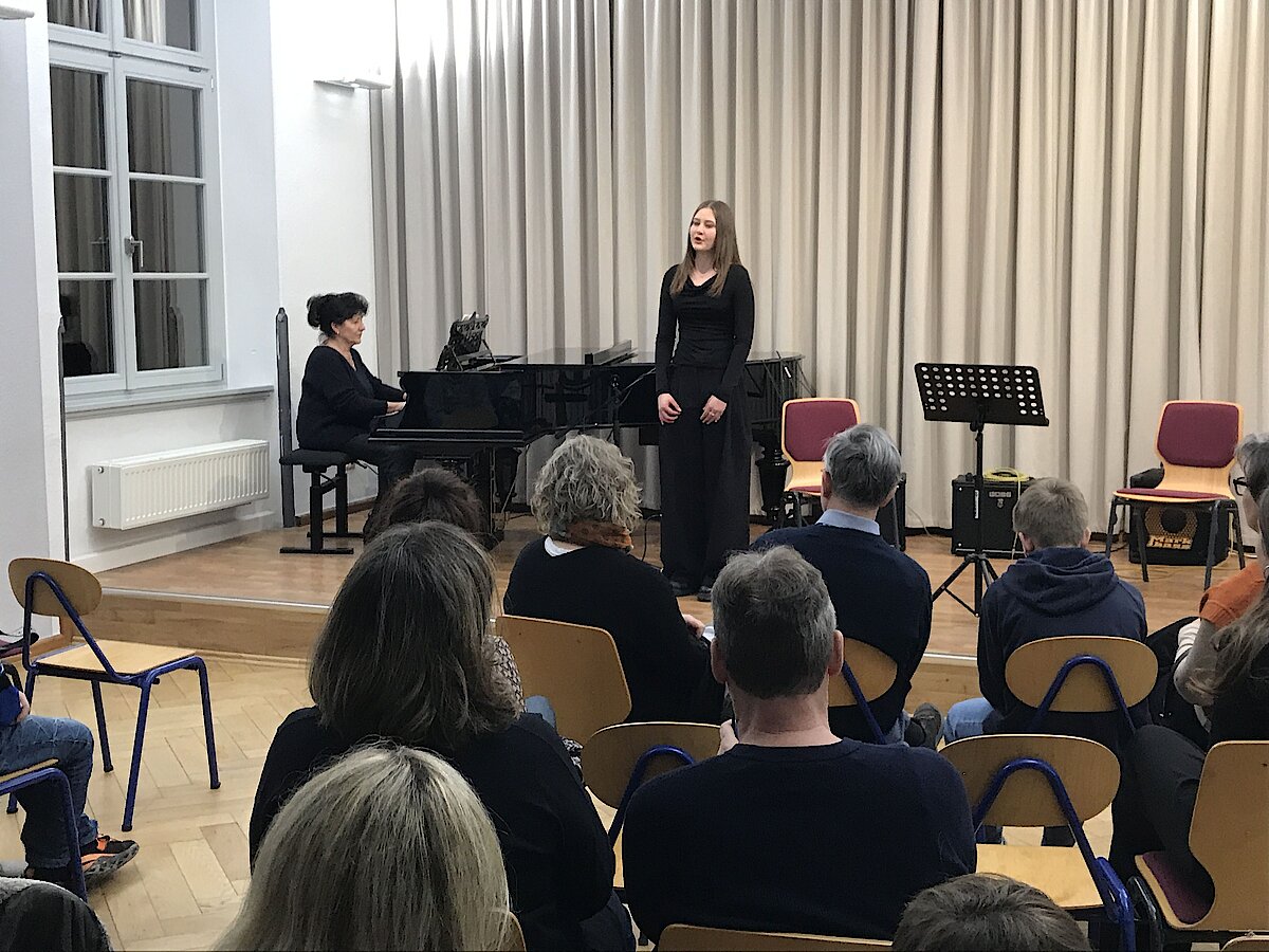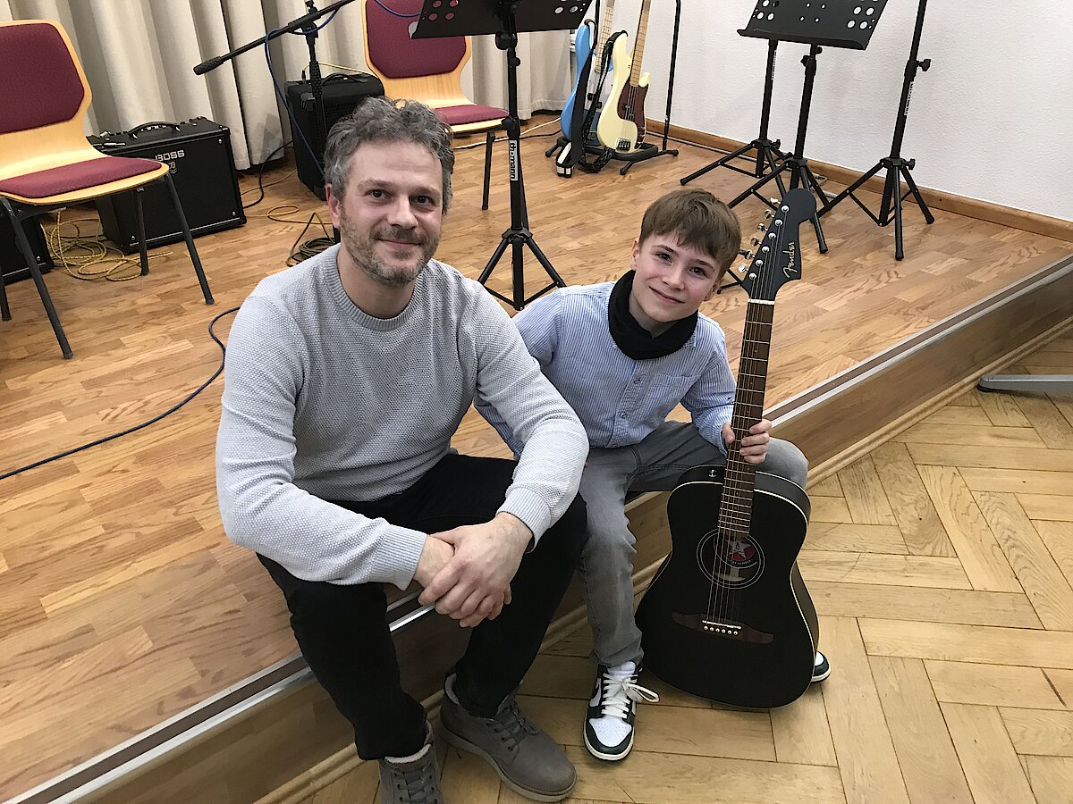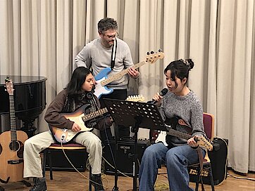 Auch wenn die Erkältungszeit einige geplante Darbietungen verhinderte, konnten sich die Zuhörerinnen und Zuhörer über ein abwechslungsreiches Programm freuen. Den Auftakt machte Abby Wesolek auf der Gitarre mit einem beeindruckenden Mix aus Ghostrider und The Riddle, begleitet von ihrem Gitarrenlehrer Frank Neubauer. Danach zeigte Anna Kewitsch ihr Können auf dem E-Bass mit einer gefühlvollen Jazz-Etüde.