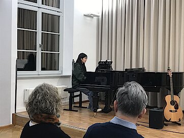 Ein spontaner Programmpunkt war der nachgemeldete Beitrag von Seoin und May, die mit She’s Electric von Oasis für rockige Klänge sorgten. Unterstützt wurden sie dabei von Markus Meiner, ihrem Gitarrenlehrer, der sie einfühlsam auf dem Bass begleitete. Zum Abschluss spielte Yaoyi Huang am Flügel den 3. Satz aus Beethovens Sonate in E-Dur. Auch wenn das anspruchsvolle Stück sie sichtlich forderte, zeigte sie großen Einsatz und stellte sich mutig der Herausforderung.