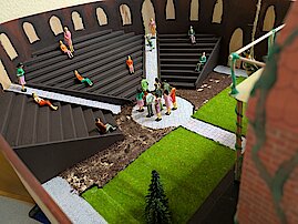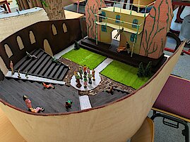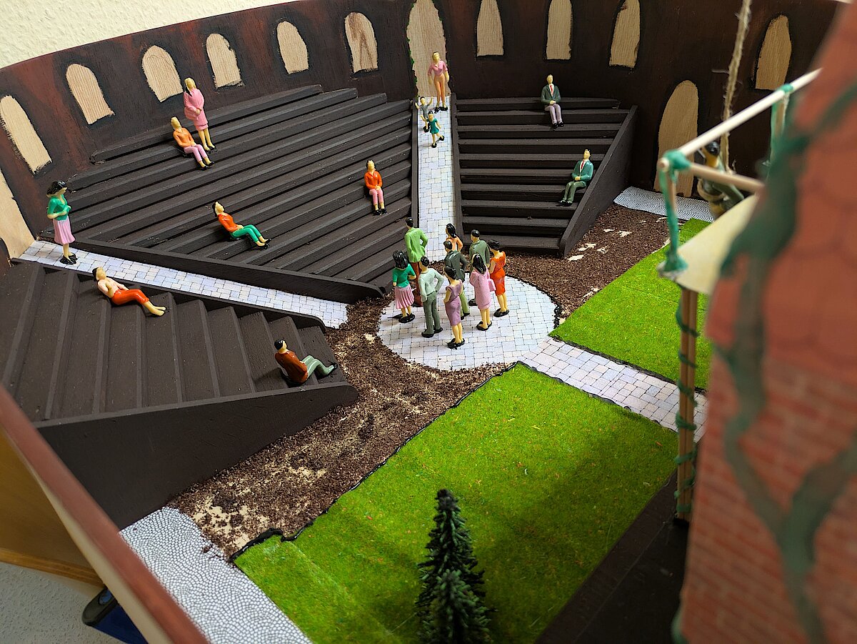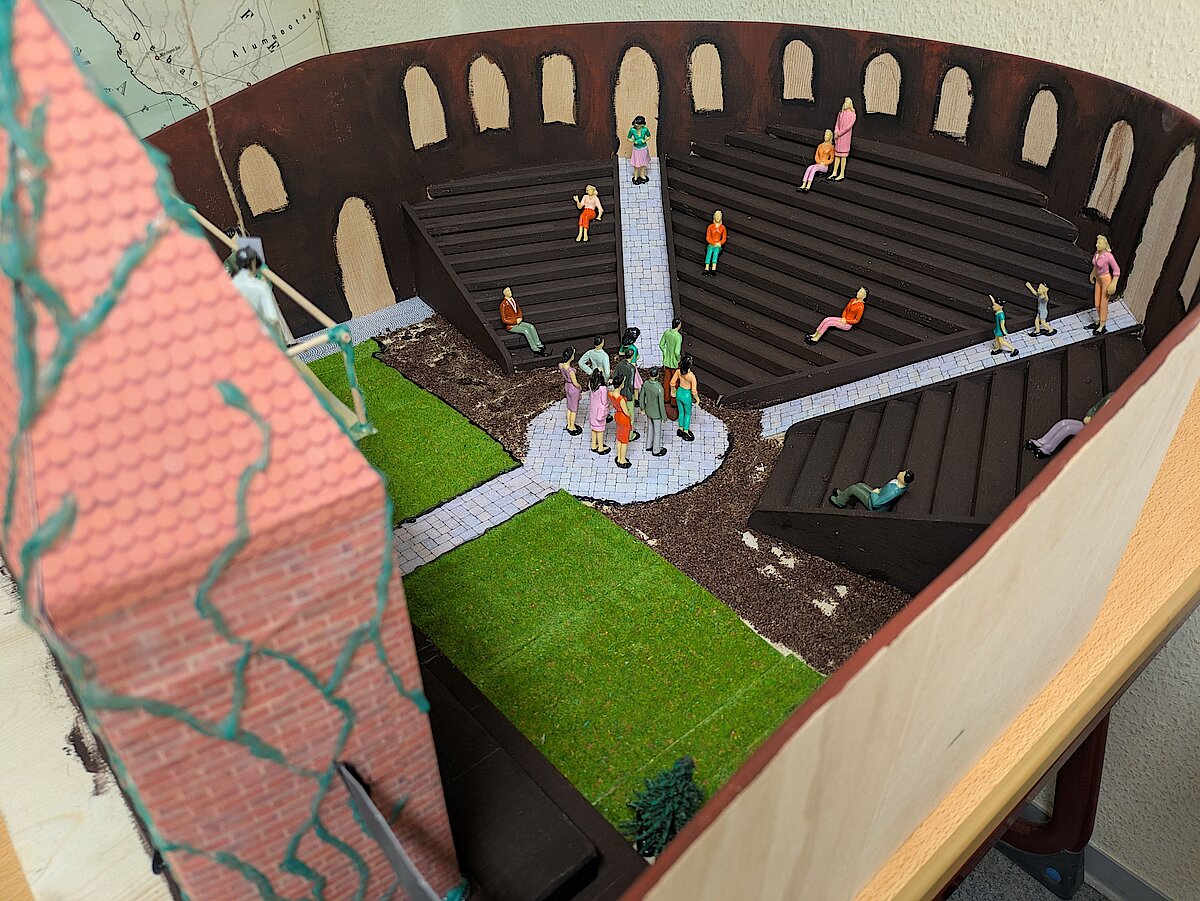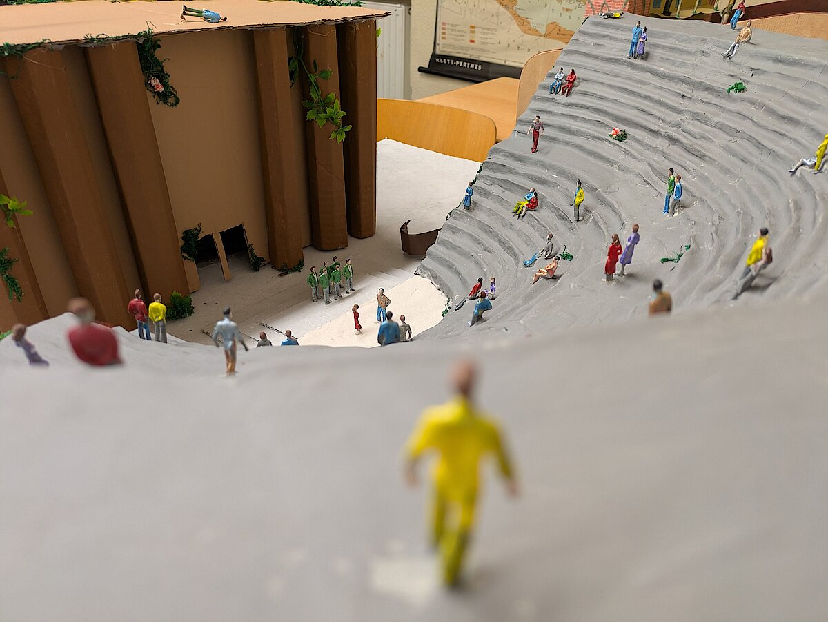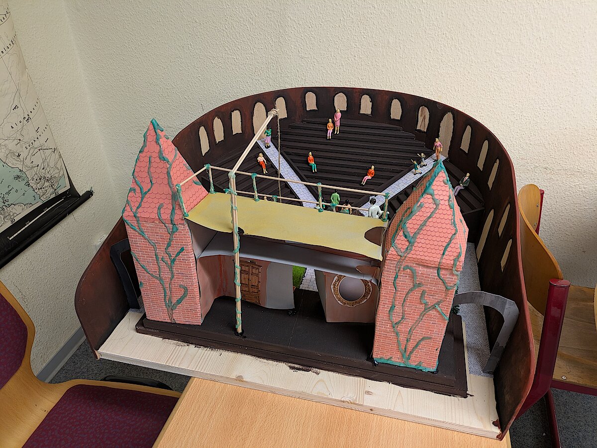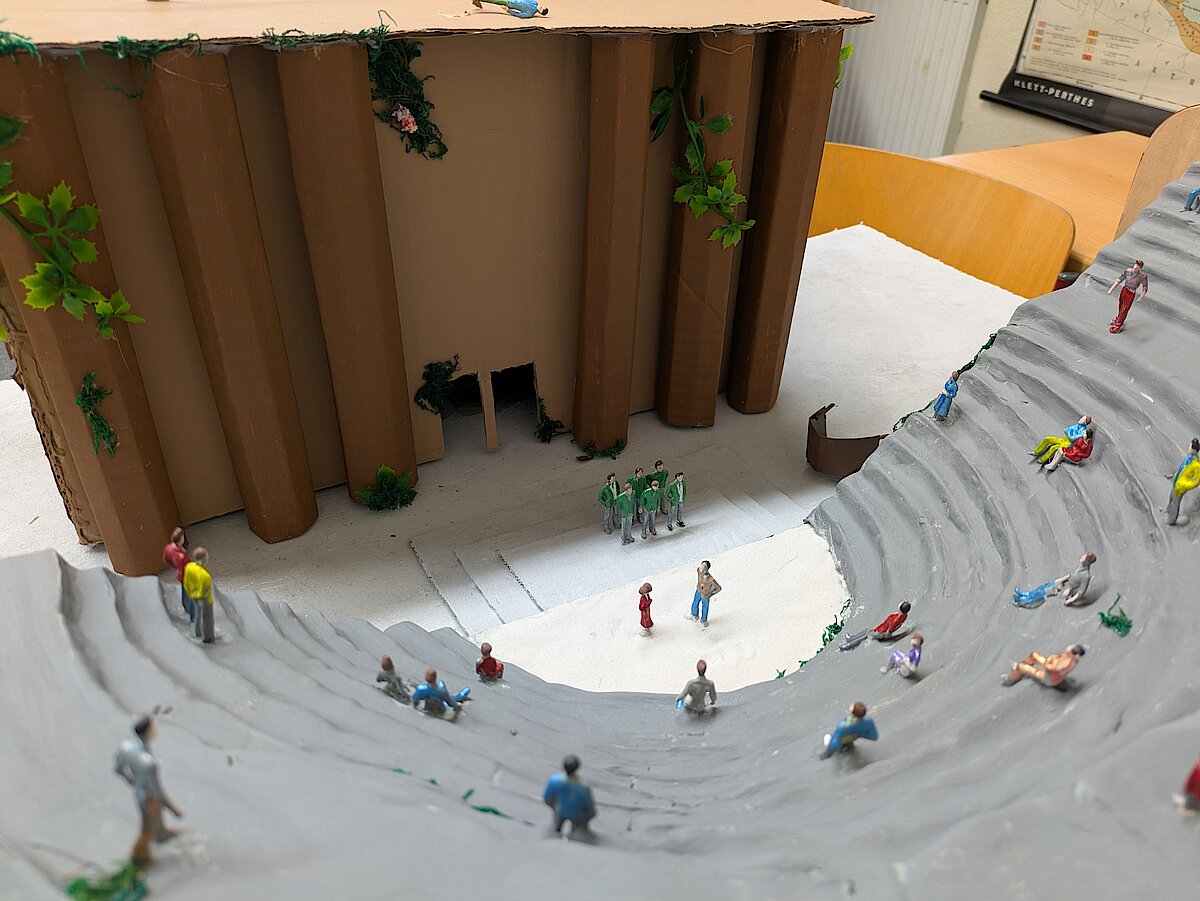 Der Lateinunterricht muss nicht immer trocken und voll von Vokabeln sein – das beweist unsere Klasse 9. Im Rahmen ihres Projekts „Antikes Theater“ wurden beeindruckende Kunstwerke geschaffen. Dabei setzten sich die Schülerinnen und Schüler intensiv mit den Einrichtungen, wie dem antiken Theater aus dieser Epoche, auseinander und erforschten sie. Wie ist das Theater aufgebaut? Welche Bestandteile gab es zu dieser Zeit?