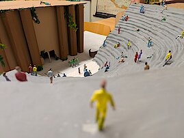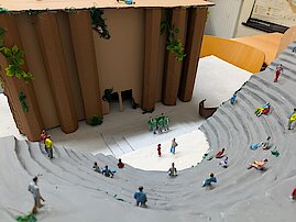 In den Kunstwerken spiegeln sich die verschiedenen Facetten wider, wie „das Theatron“, „das Orchestra“ oder „die Skele“. Wichtige Elemente, welche in einem antiken Theater zu finden sind.
