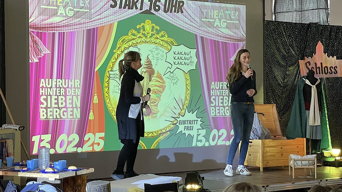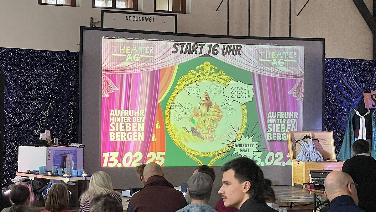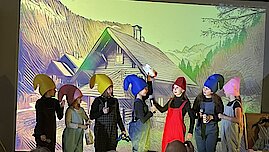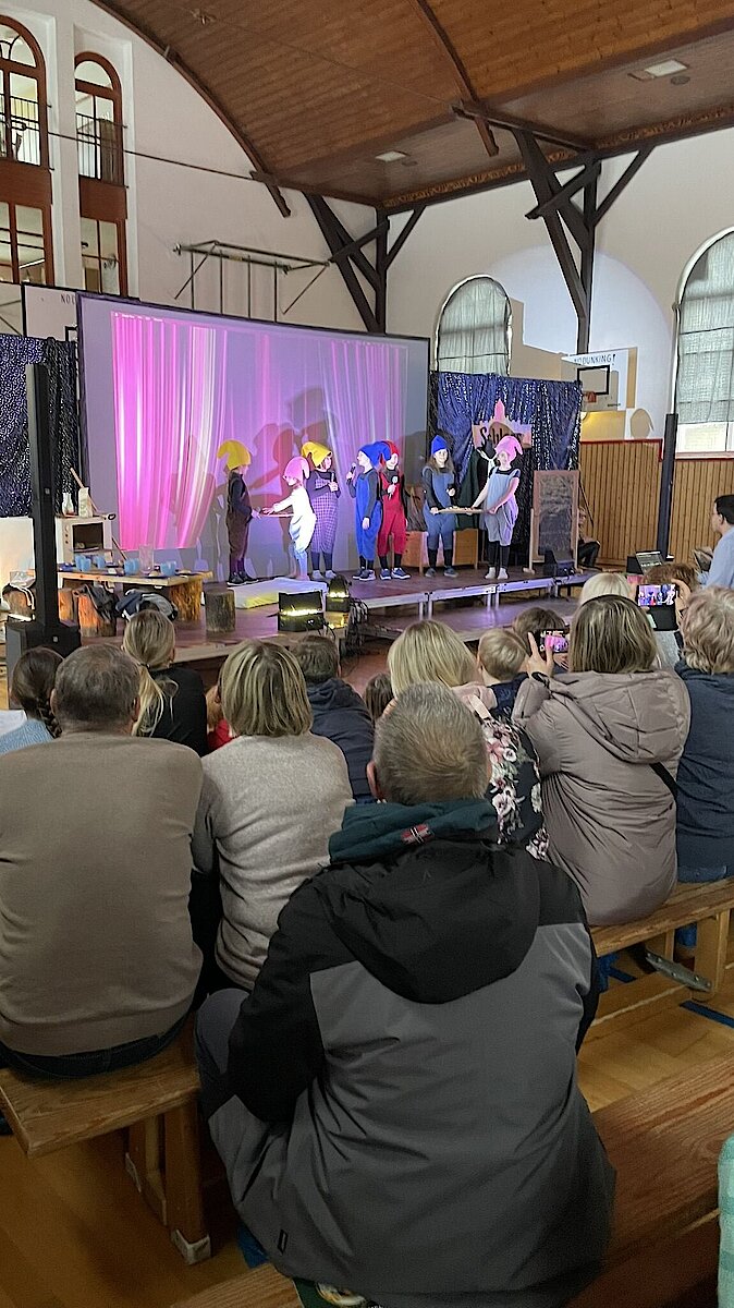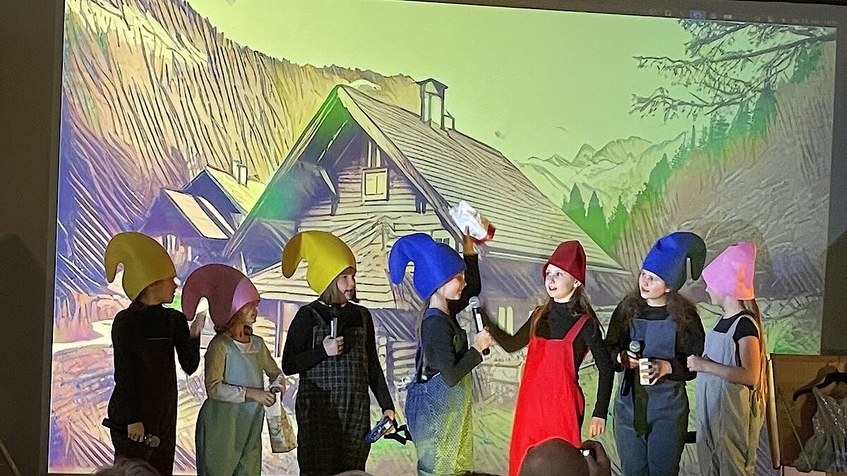 Mit etwas Verspätung begann das Theaterstück unter der Leitung von Frau Scheere, die das Publikum mit der humorvollen Einleitung „… und das geht doch“ willkommen hieß. Schon nach den ersten Minuten war klar: Dieser Abend würde lustig und fröhlich werden! Über „700 Tage lang“ führte die Reise durch sieben Weggabelungen, immer mit der Frage: Wo findet man die Zwerge?