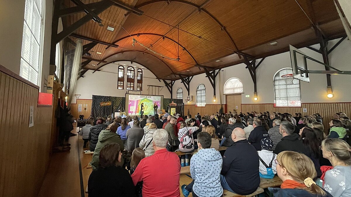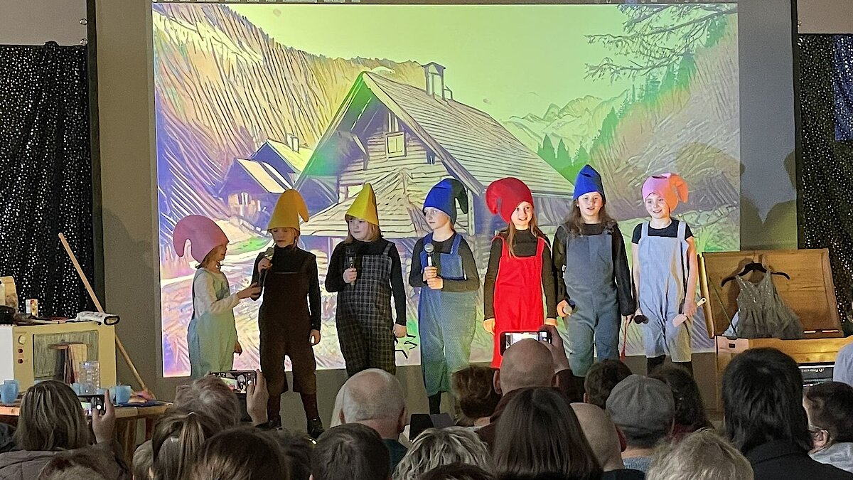 Nach einem unterhaltsamen Film-Intro über die sieben Zwerge der Grundschule wurden die kleinen Helden wie durch Zauberhand auf die Bühne geholt. Frech und munter machten sie sich jedoch nicht auf den Weg ins Bergwerk, sondern ans „Backwerk“. Das Publikum klatschte begeistert im Zwergentakt mit.