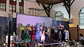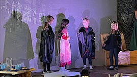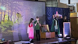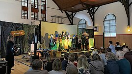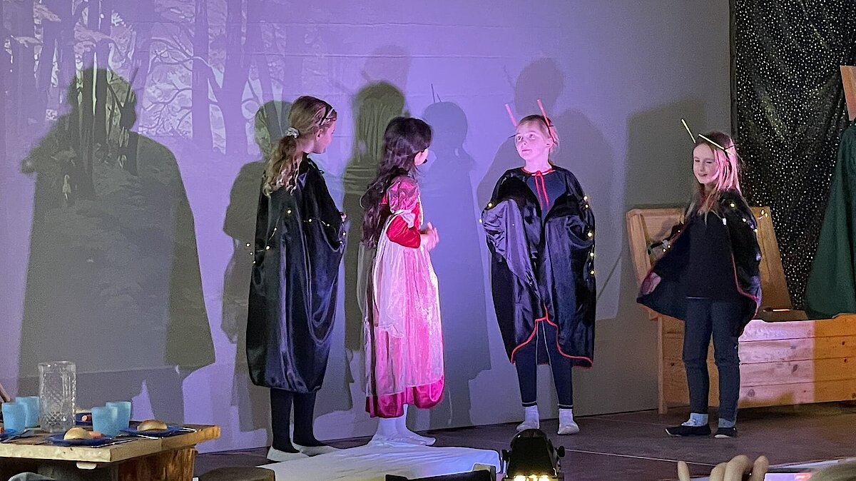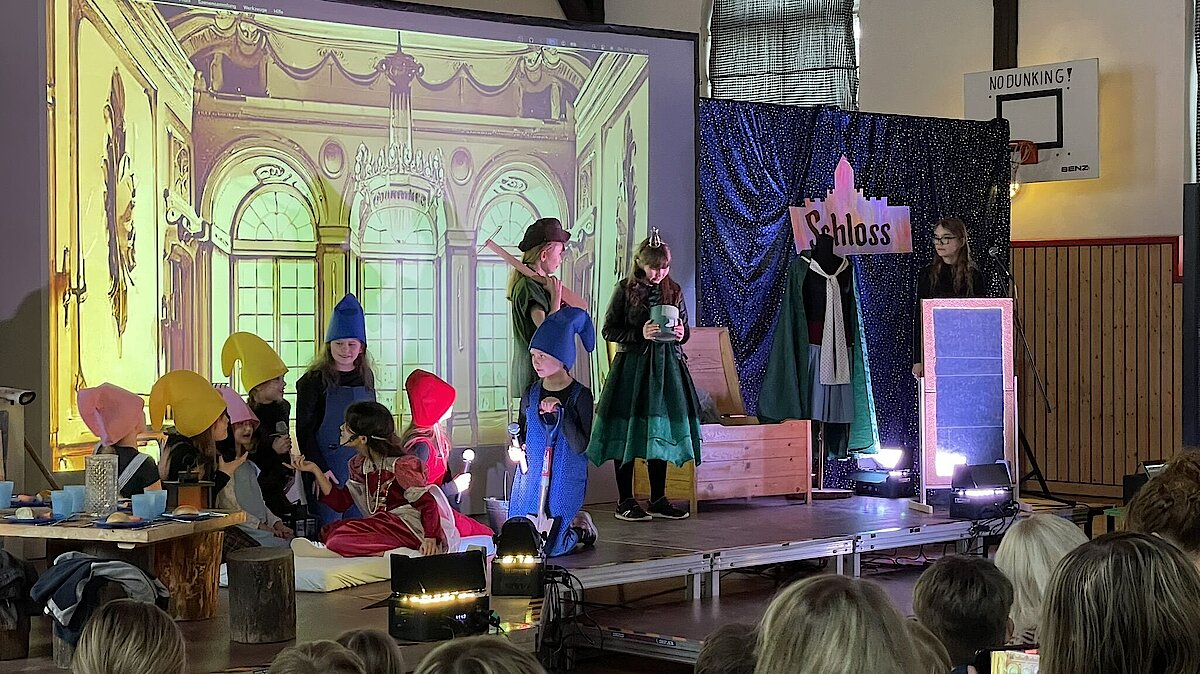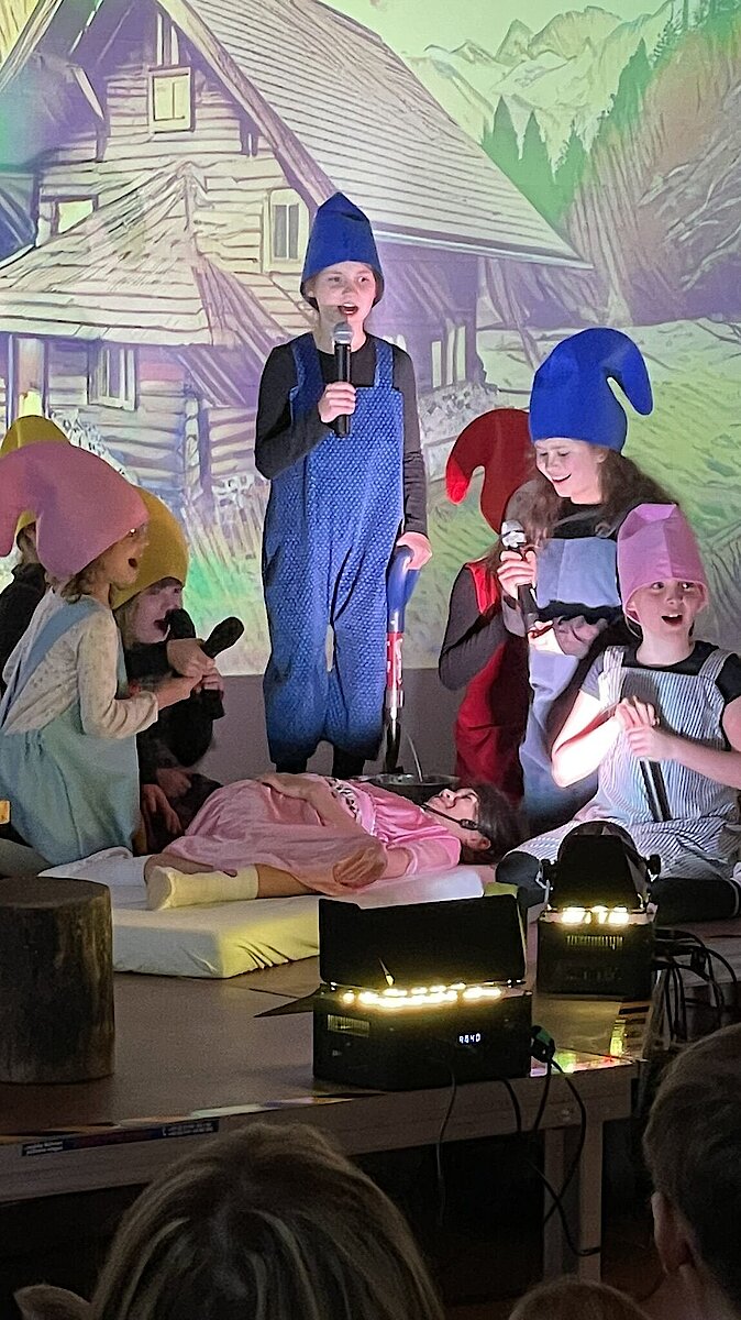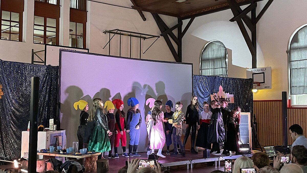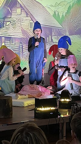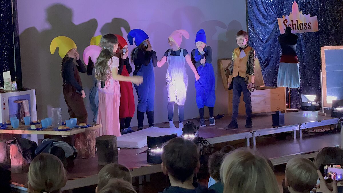 Das Stück endete mit einem fröhlichen Abschlussfest und einer musikalischen Verabschiedung. Dankesworte gingen an Familie Lange für die wunderschöne Deko und das Farbkonzept sowie an Herrn Gehra für die Technik. Besonders herzlich bedankten sich die Zwerge bei Frau Scheere und Frau Scheibner für die Organisation der Theater-AG sowie bei den Eltern für ihre Unterstützung.