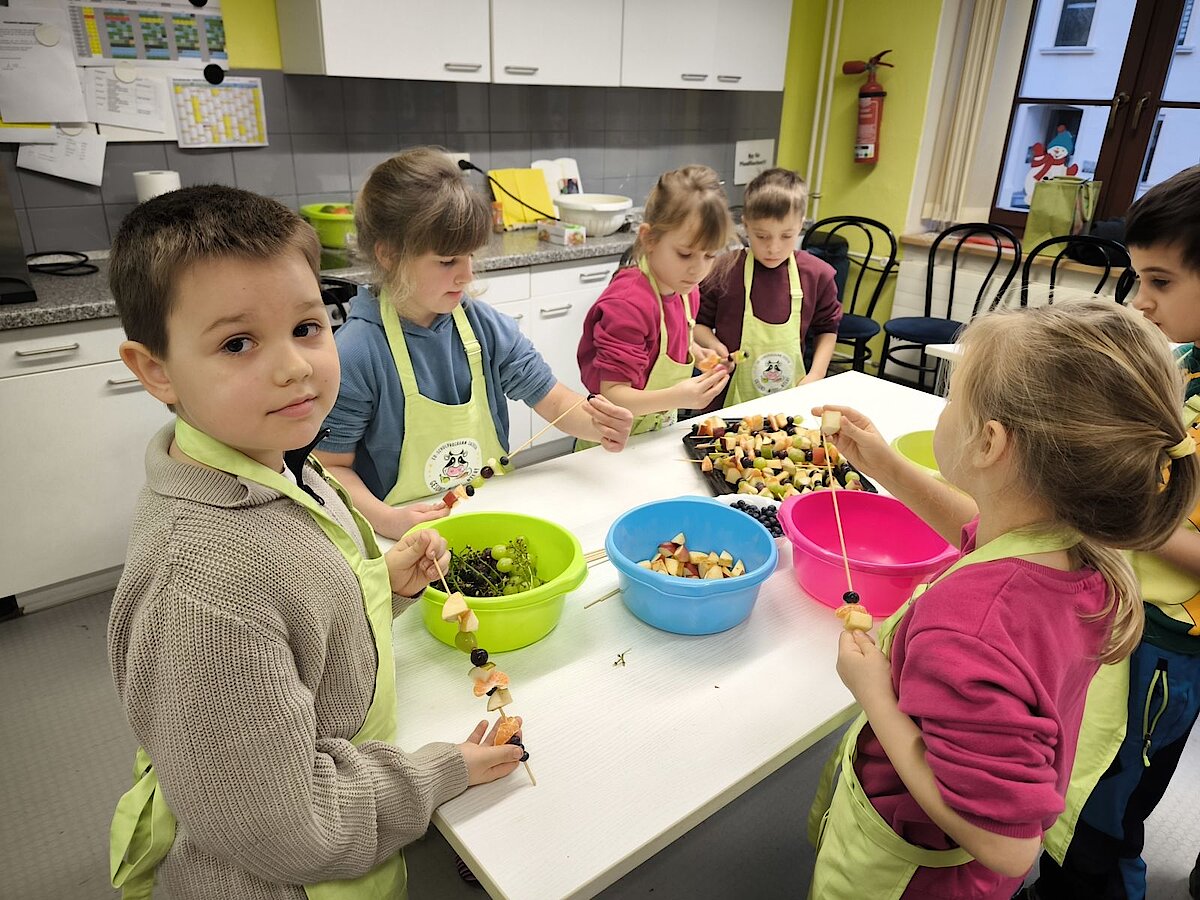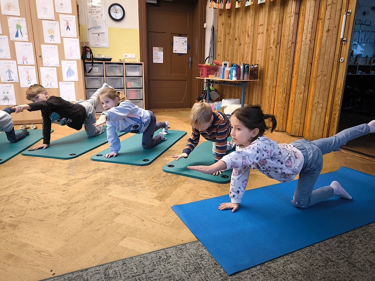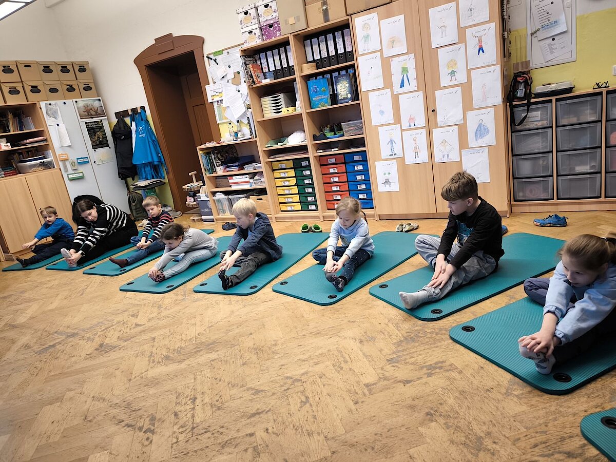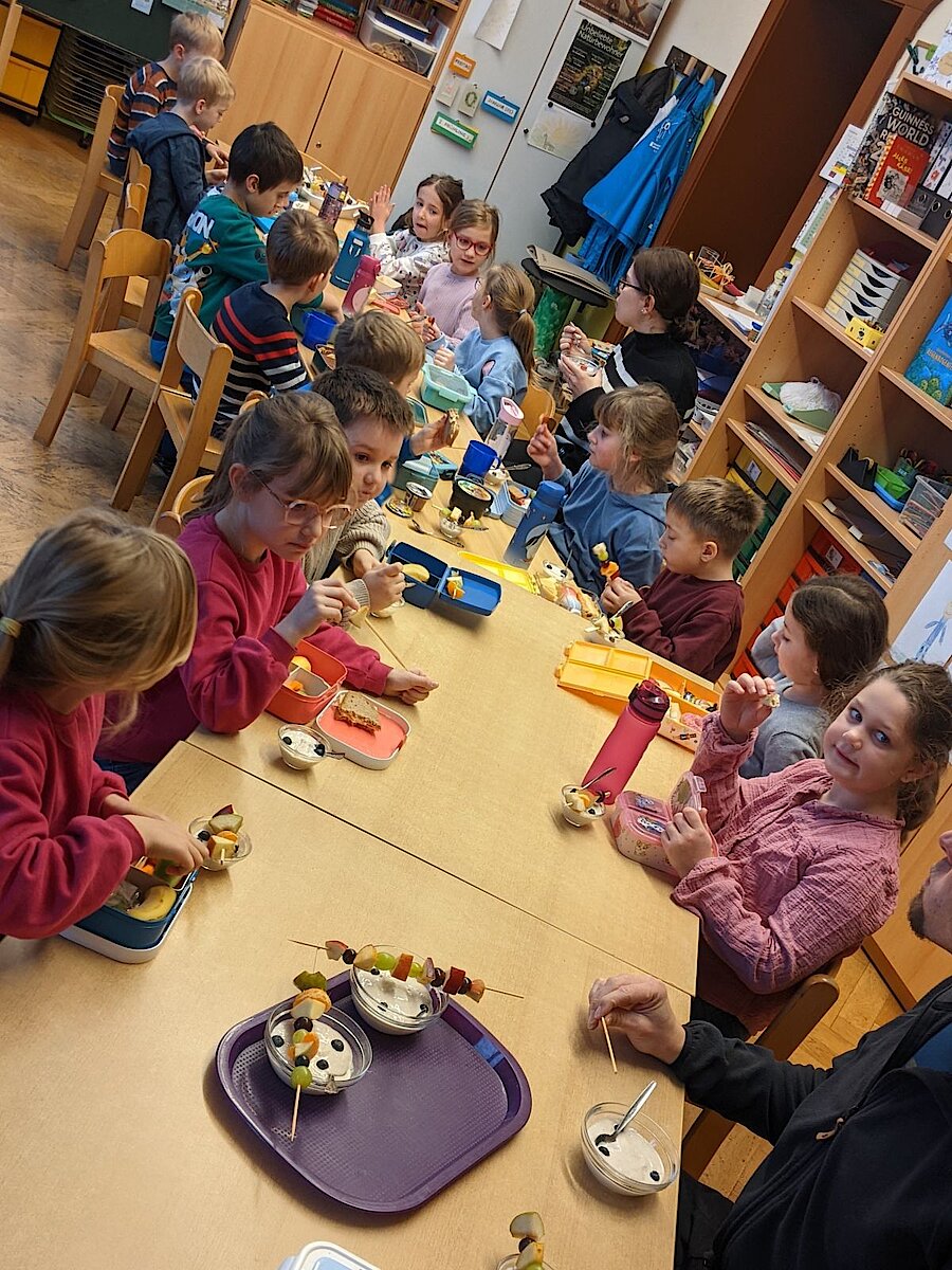 Im Rahmen des Unterrichtsthemas „Mein Körper, meine Gesundheit“, erlebten wir im Januar 2025 abwechslungsreiche Stunden im Sachunterricht. Die Kinder beschäftigten sich mit Obst und Gemüse und fanden heraus, dass das Lieblingsgemüse der Klasse Möhren und das Lieblingsobst Kirschen sind. Sie besprachen, was gut/nicht gut für ihre Zähne ist und erstellten dazu eine Collage. Auch Körperpflege war Thema und die richtige Kleidung entsprechend der Jahreszeit. Natürlich gehört auch Sport zur Gesunderhaltung des Körpers und so erlebten die Kinder eine Yogastunde mit vielfältigen Übungen zur Kräftigung und Entspannung desselben. Herr Wolf, ein Papa aus der Klasse, leitete die Kinder dabei an. Vielen Dank noch einmal für diese schöne, bewegungsreiche Stunde. Mit Begeisterung waren die Kinder auch beim Zubereiten eines Bananenquarks und Obstspießen dabei. Beides wurde zum Frühstück nach der Yogastunde mit hörbarem Genuss gemeinsam verspeist. Lecker!