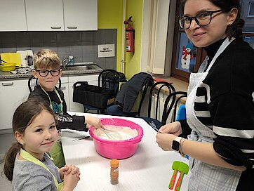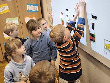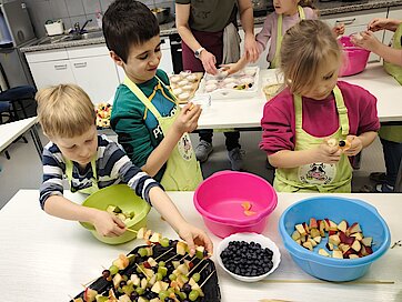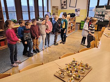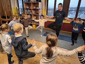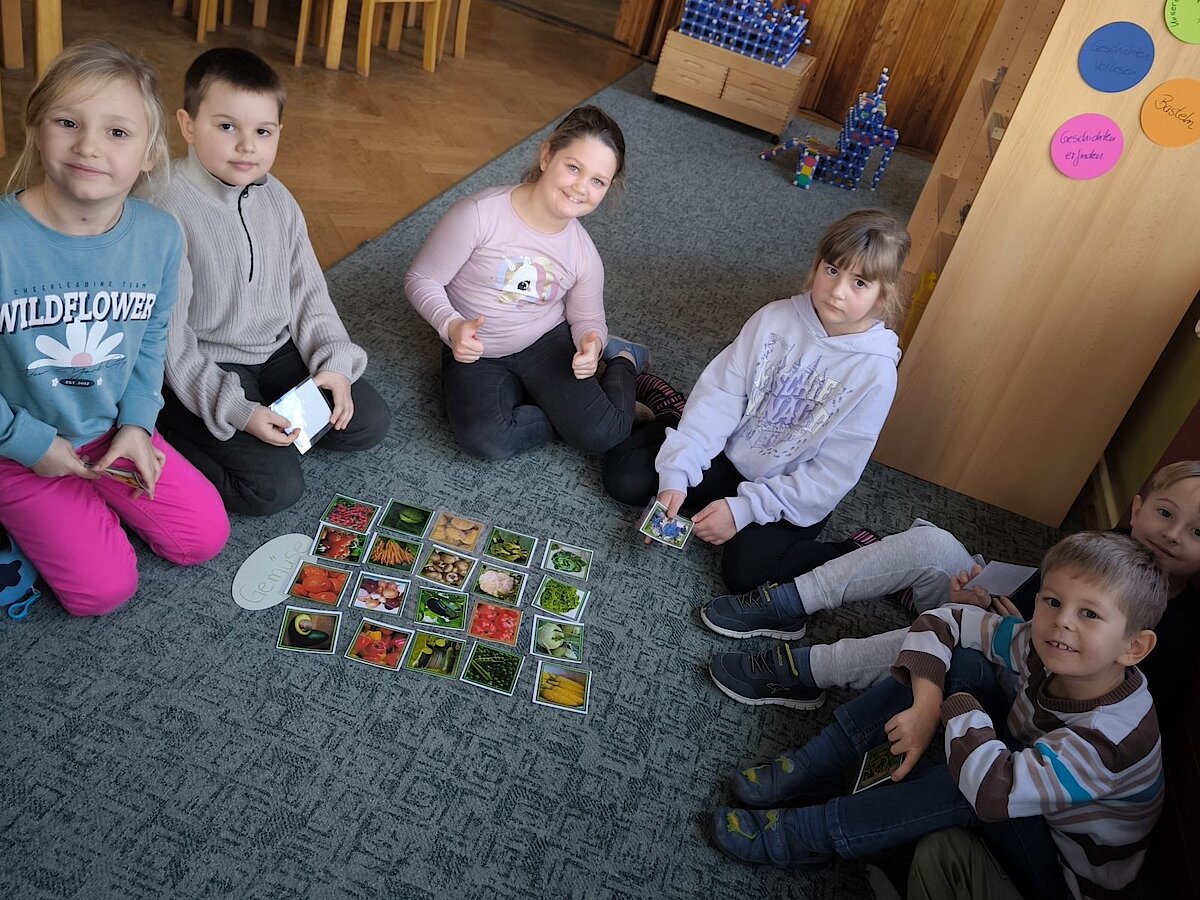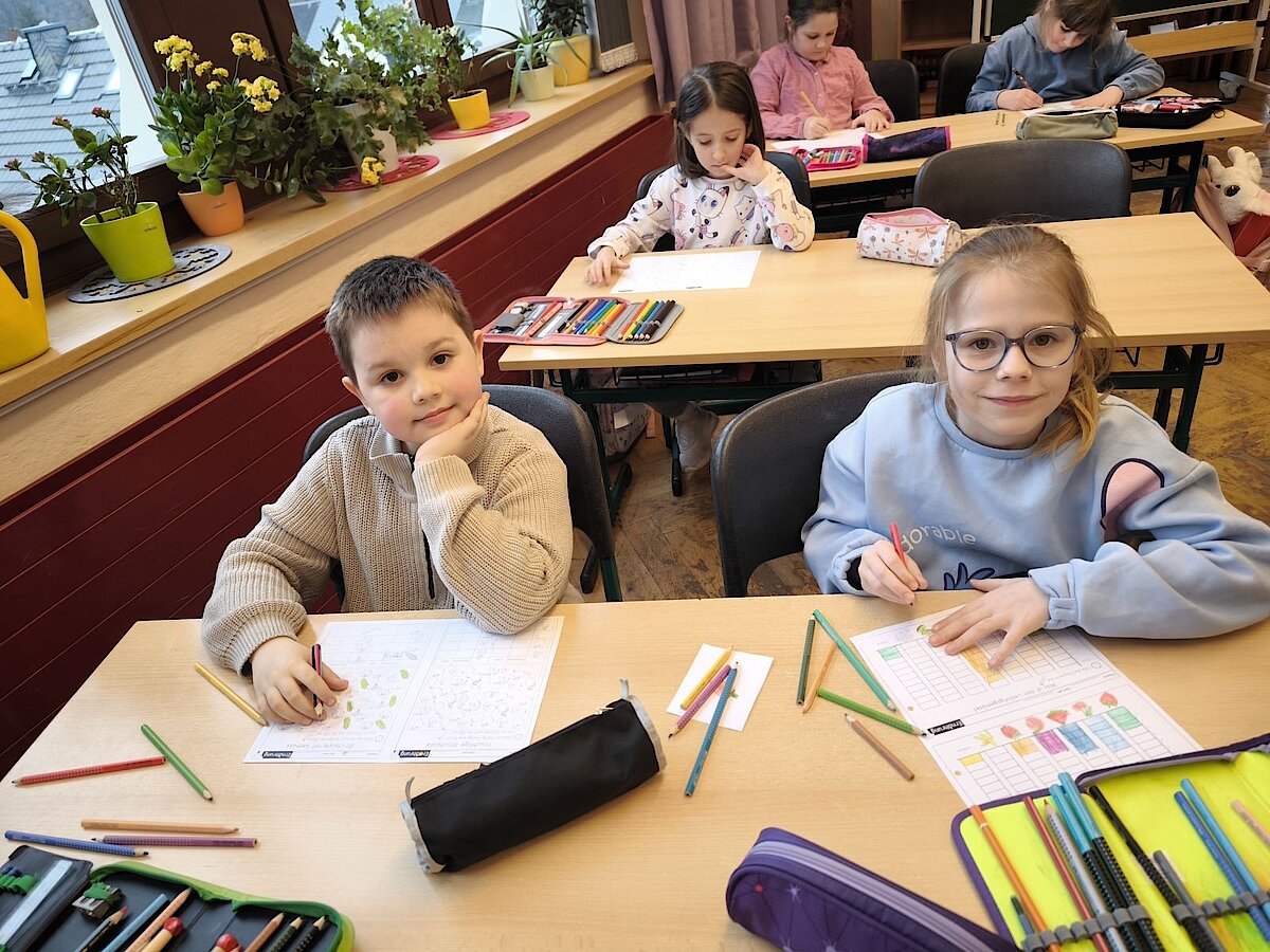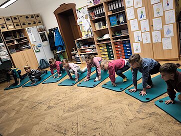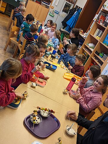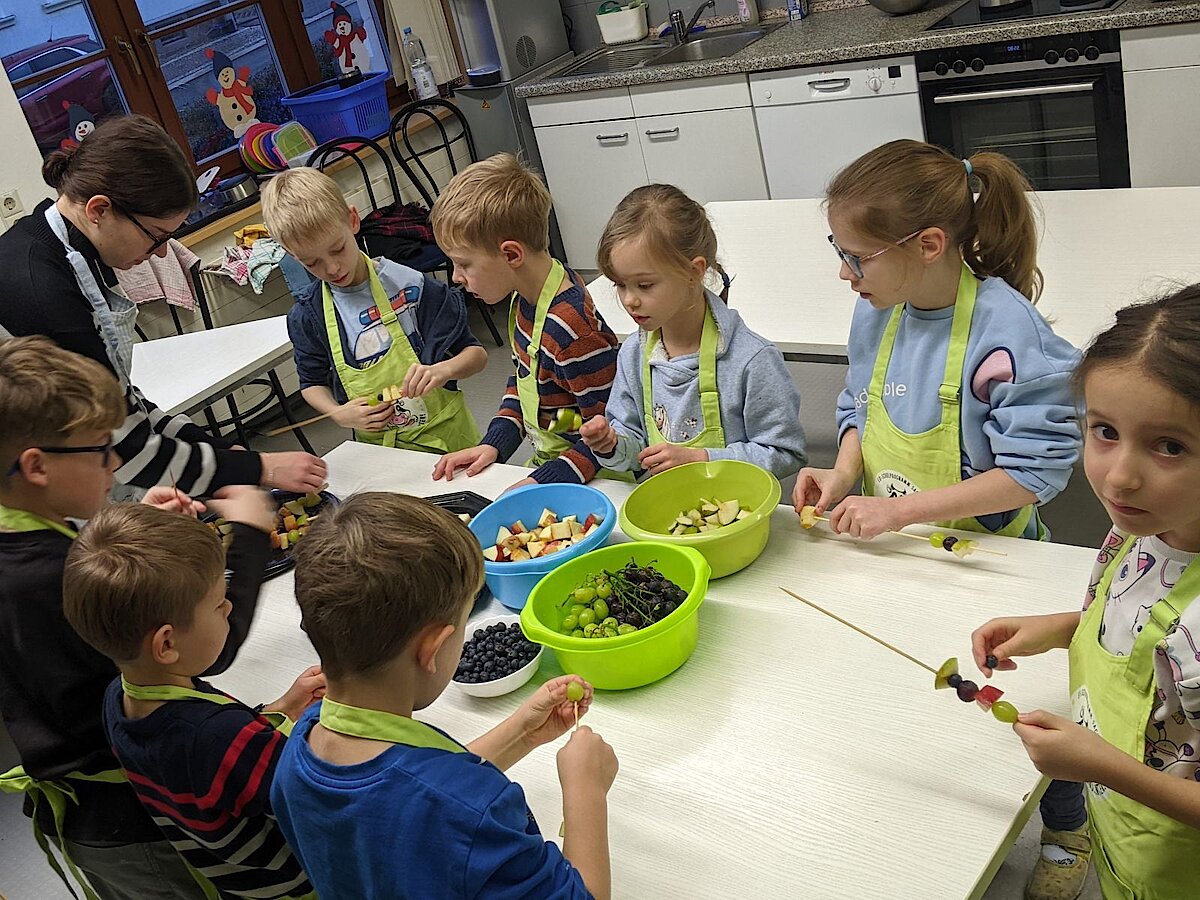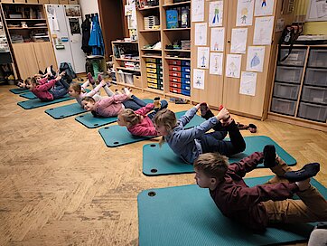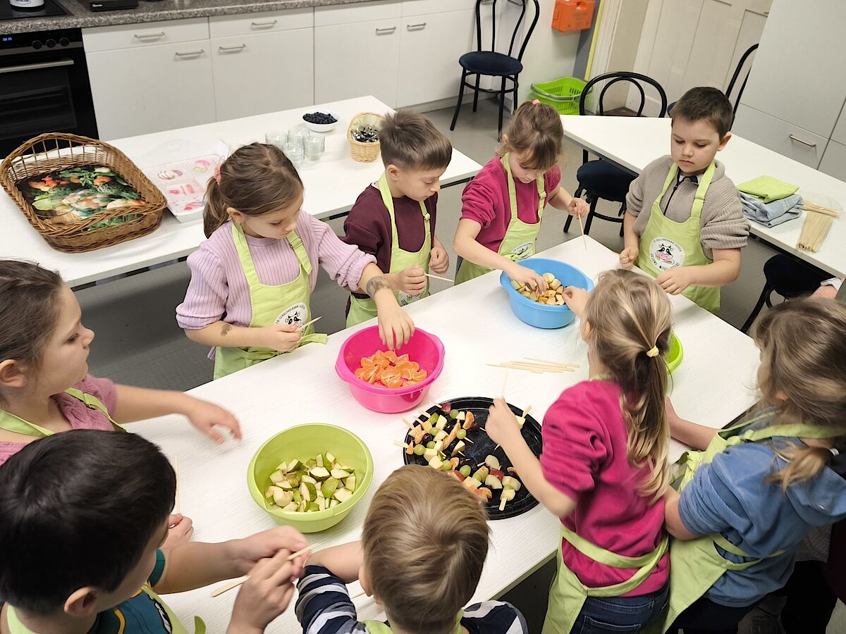 Im Rahmen des Unterrichtsthemas „Mein Körper, meine Gesundheit“, erlebten wir im Januar 2025 abwechslungsreiche Stunden im Sachunterricht. Die Kinder beschäftigten sich mit Obst und Gemüse und fanden heraus, dass das Lieblingsgemüse der Klasse Möhren und das Lieblingsobst Kirschen sind. Sie besprachen, was gut/nicht gut für ihre Zähne ist und erstellten dazu eine Collage. Auch Körperpflege war Thema und die richtige Kleidung entsprechend der Jahreszeit. Natürlich gehört auch Sport zur Gesunderhaltung des Körpers und so erlebten die Kinder eine Yogastunde mit vielfältigen Übungen zur Kräftigung und Entspannung desselben. Herr Wolf, ein Papa aus der Klasse, leitete die Kinder dabei an. Vielen Dank noch einmal für diese schöne, bewegungsreiche Stunde. Mit Begeisterung waren die Kinder auch beim Zubereiten eines Bananenquarks und Obstspießen dabei. Beides wurde zum Frühstück nach der Yogastunde mit hörbarem Genuss gemeinsam verspeist. Lecker!