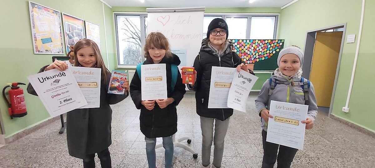 Anfang März war es endlich so weit. Luise und Gretha aus Klasse 3 und Delia und Helena aus Klasse 4 maßen sich im Wettbewerb mit insgesamt 65 Schülerinnen und Schülern der 3. und 4. Klassenstufe aus 19 Grundschulen des Landkreises Zwickau.