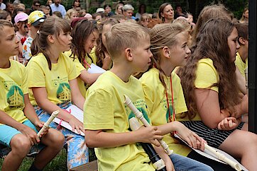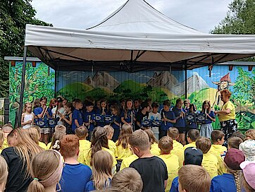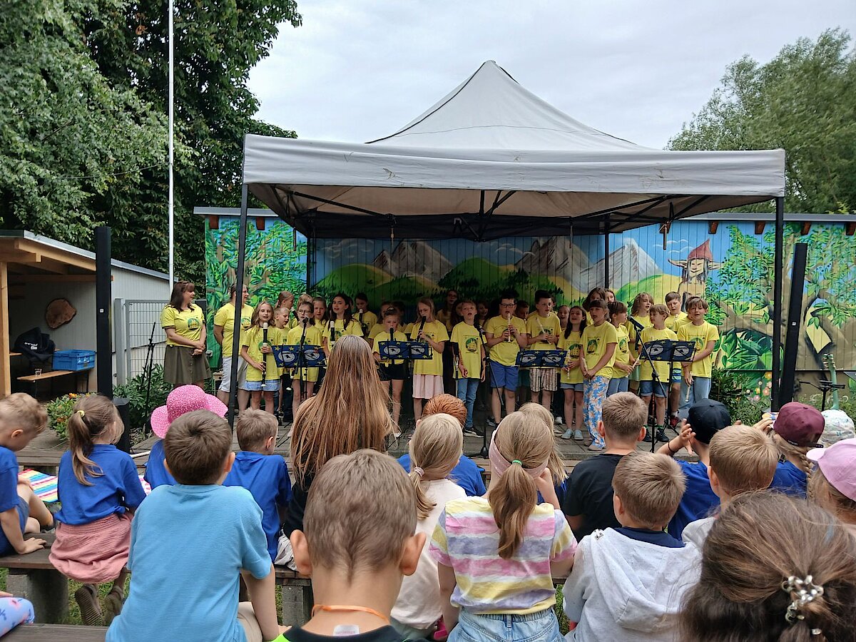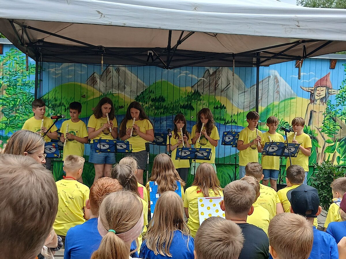 Die Klassen 1 bis 3 hatten jeweils ein kleines Stück einstudiert. So besuchten sie unter anderen die Tiere am Teich, freuten sich darüber, wie schön es ist auf der Welt zu sein oder zeigten auf den Flöten, was sie bereits gelernt haben.
