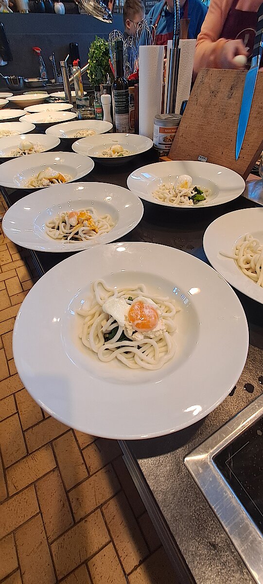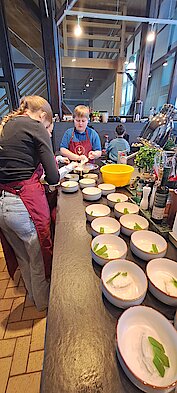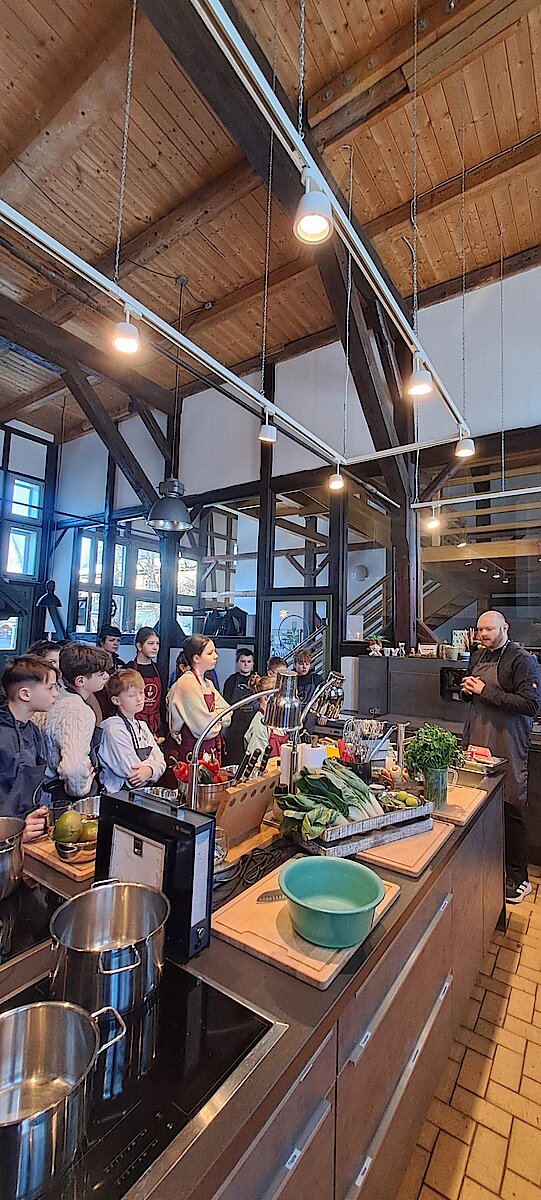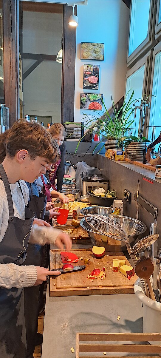 Wir waren die allererste Schülergruppe, die dort die Geheimnisse der Kochkunst kennenlernen durfte: der erste Kids-Kurs überhaupt. Die Schülerinnen und Schüler bereiteten selbstständig ein 3-Gänge-Menü zu.
