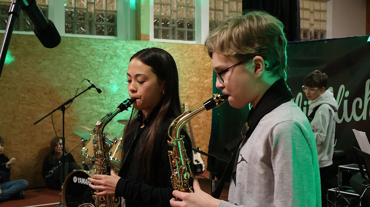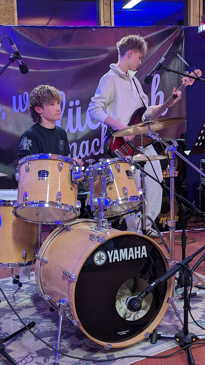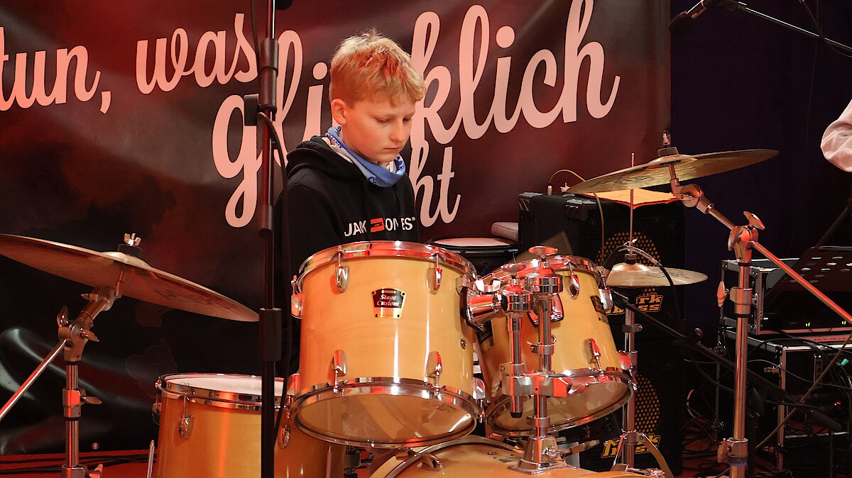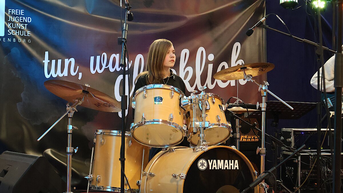 Neben den Schülerinnen und Schülern des Gymnasiums und der Oberschule freute sich das Publikum auch über zwei Schüler der Jugendkunstschule. Julian Süchting, der regelmäßig Schlagzeugunterricht nimmt, zeigte an diesem Abend sein bereits Erlerntes mit einem Song von Linkin Park. Außerdem begeisterte das Ausnahmetalent Jaron Kaden, der im Rahmen der Begabtenförderung unterstützt wird, ebenfalls am Schlagzeug. Mit einer eigenen Komposition und weiteren Stücken unterhielt er das Publikum eindrucksvoll.