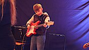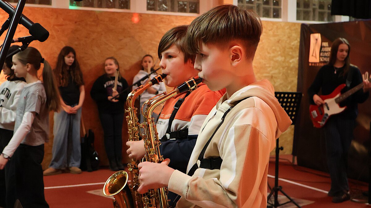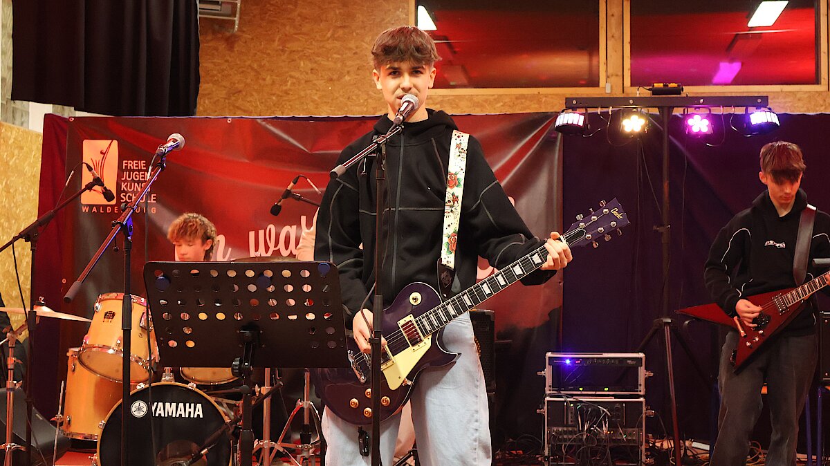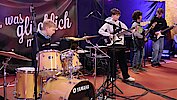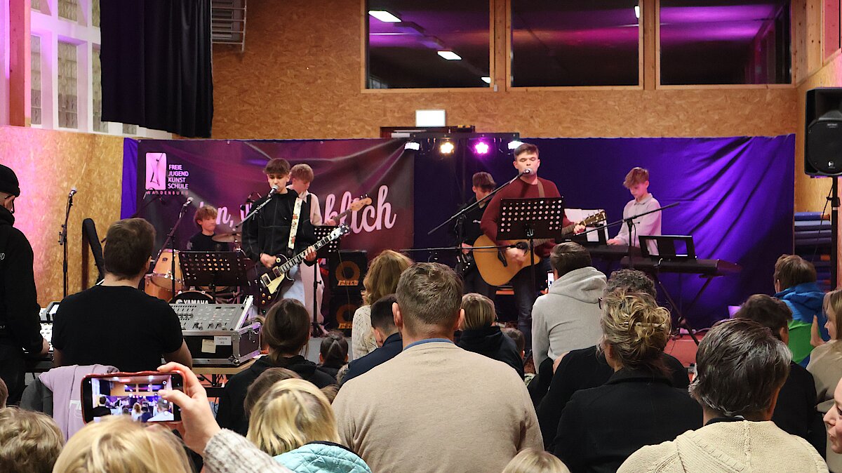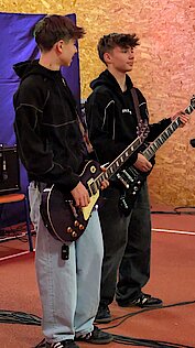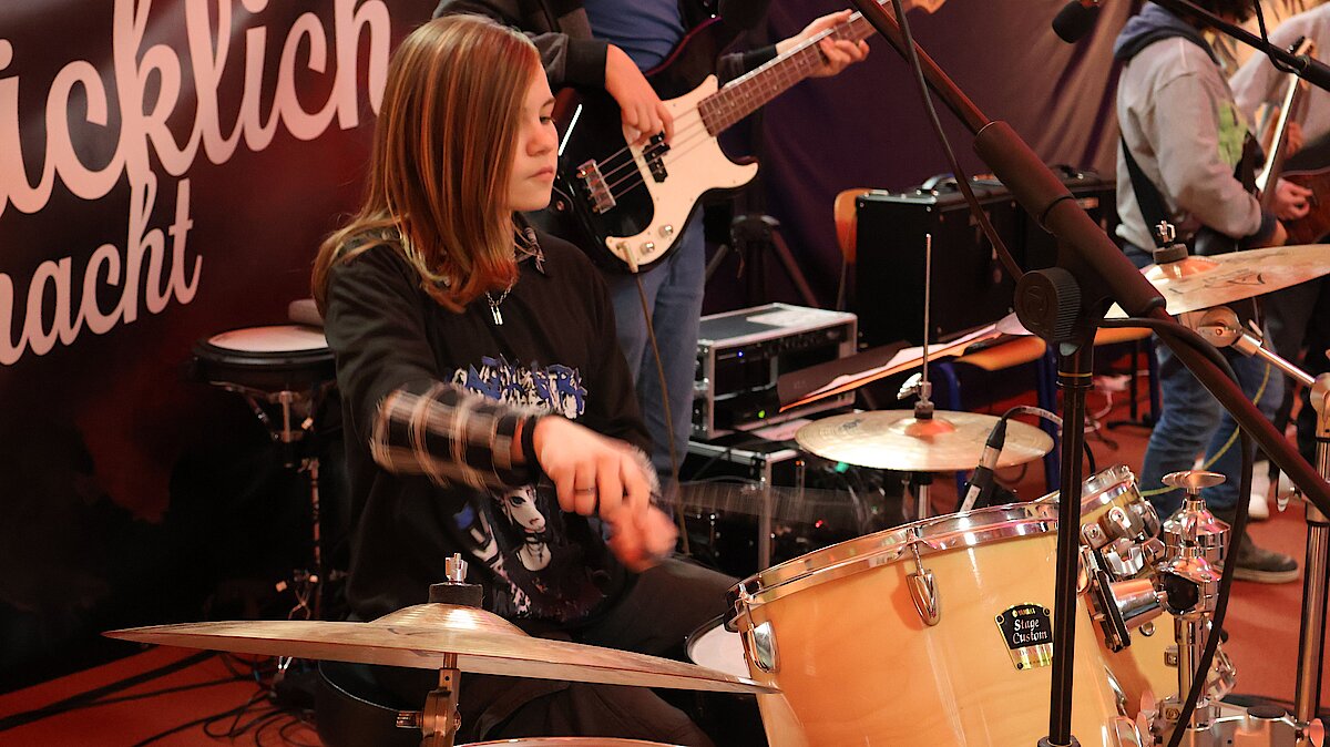Neben den Schülerinnen und Schülern des Gymnasiums und der Oberschule freute sich das Publikum auch über zwei Schüler der Jugendkunstschule. Julian Süchting, der regelmäßig Schlagzeugunterricht nimmt, zeigte an diesem Abend sein bereits Erlerntes mit einem Song von Linkin Park. Außerdem begeisterte das Ausnahmetalent Jaron Kaden, der im Rahmen der Begabtenförderung unterstützt wird, ebenfalls am Schlagzeug. Mit einer eigenen Komposition und weiteren Stücken unterhielt er das Publikum eindrucksvoll.